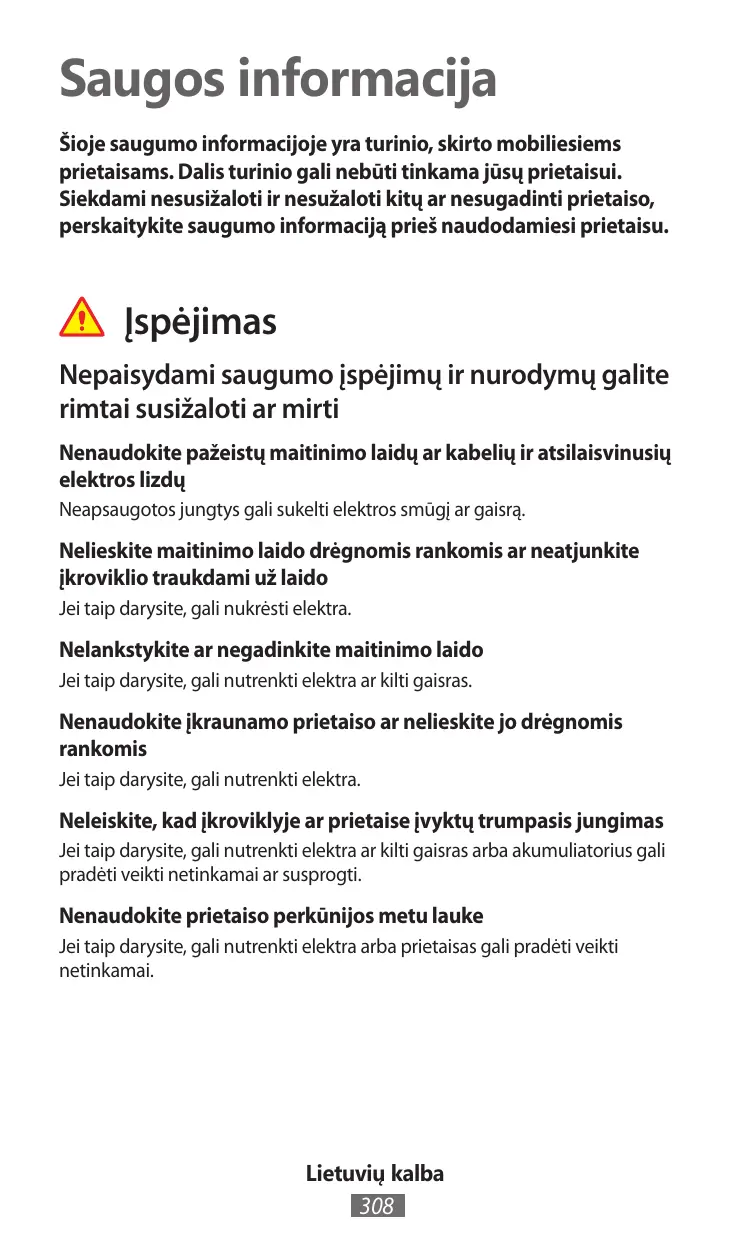 Naudokitės tik gamintojo patvirtintais akumuliatoriais, įkrovikliais, priedais ir resursais • Naudodami ne originalius akumuliatorius ar įkroviklius galite sutrumpinti naudojimosi prietaisu laiką arba prietaisas gali pradėti veikti netinkamai. Tai taip pat gali sukelti gaisrą ar akumuliatoriaus sprogimą. • Naudokitės tik „Samsung“ patvirtintais akumuliatoriais ir įkrovikliais, skirtais jūsų prietaisui. Nesuderinamas akumuliatorius ir įkroviklis gali rimtai sužaloti jus ar sugadinti prietaisą. • „Samsung“ negali būti atsakinga už naudotojo saugumą naudojant „Samsung“ neaprobuotus priedus.