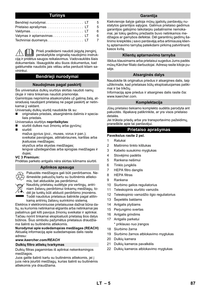 Téléchargez la notice de votre Dulkių siurblys su indeliu au format PDF gratuitement ! Retrouvez votre notice VCS - KARCHER et reprennez votre appareil électronique en main. Sur cette page sont publiés tous les documents nécessaires à l'utilisation de votre appareil VCS de la marque KARCHER.