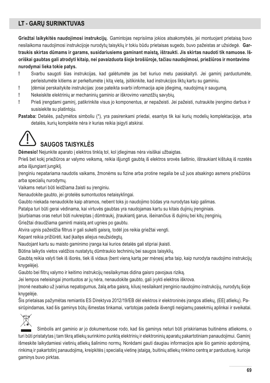 Avant toute opération de nettoyage ou d’entretien, débrancher la hotte du circuit électrique en retirant la prise ou en coupant l’interrupteur général de l’habitation. Munissez-vous de gants de travail avant d’effectuer toute opération d’installation et d’entretien. L’appareil n’est pas destiné à une utilisation par des enfants ou des personnes à capacités physiques, sensorielles ou mentales réduites et sans expérience et connaissance à moins qu’ils ne soient sous la supervision ou formés sur l’utilisation de l’appareil par une personne responsable de leur sécurité. Les enfants doivent être surveillés afin qu’ils ne jouent pas avec l’appareil. Ne jamais utiliser la hotte sans que la grille ne soit montée correctement! La hotte ne doit JAMAIS être utilisée comme plan pour déposer quelque chose sauf si cela est expressément indiqué. Quand la hotte est utilisée en même temps que d’autres appareils à combustion de gaz ou d’autres combustibles, le local doit disposer d’une ventilation suffisante. L’air aspiré ne doit jamais être envoyé dans un conduit utilisé pour l’évacuation des fumées produites par des appareils à combustion de gaz ou d’autres combustibles. Il est formellement interdit de faire flamber les aliments sous la hotte. L’utilisation de flammes libres peut entraîner des dégâts aux filtres et peut donner lieu à des incendies, il faut donc les éviter à tout prix. La friture d’aliments doit être réalisée sous contrôle pour éviter que l’huile surchauffée ne prenne feu. Les pièces accessibles peuvent se réchauffer de façon importante quand elles sont utilisées avec des appareils pour la cuisson. En ce qui concerne les mesures techniques et de sécurité à adopter pour l’évacuation des fumées, s’en tenir strictement à ce qui est prévu dans les règlements des autorités locales compétentes. La hotte doit être régulièrement nettoyée, aussi bien à l’intérieur qu’à l’extérieur (AU MOINS UNE FOIS PAR MOIS, respecter néanmoins les instructions relatives à l’entretien fournies dans ce manuel). La non observation de ces normes de nettoyage de la hotte et du changement et nettoyage des filtres comporte des risques d’incendie. Ne pas utiliser ou laisser la hotte sans que les ampoules soient correctement placées pour éviter tout risque de choc électrique. La société décline toute responsabilité pour d’éventuels inconvénients, dégâts ou incendies provoqués par l’appareil et 43