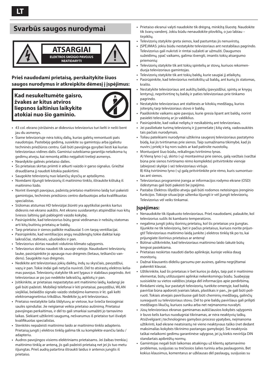 + Les télévisions avec écran de 43° ou plus doivent être soulevées et portées par au moins deux personnes.