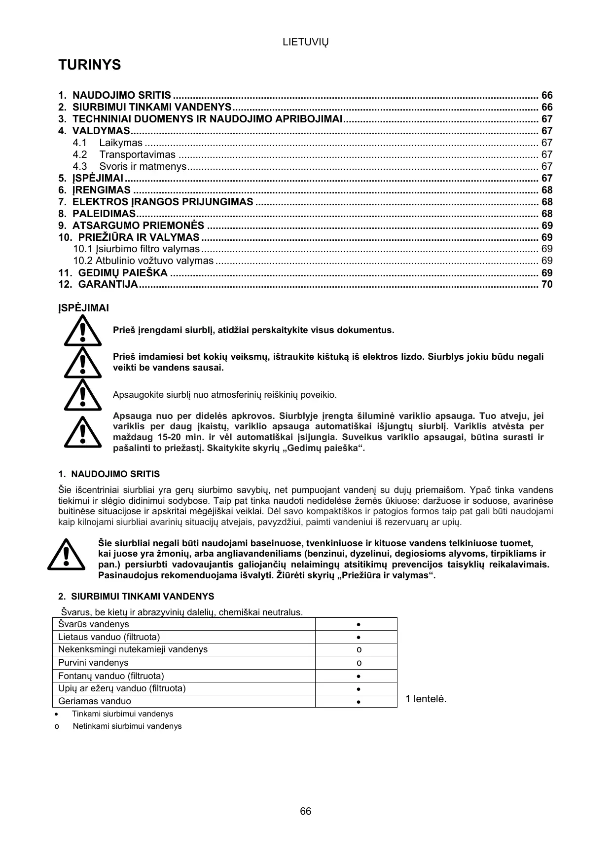 10. PRIEZIÜRA IR VALYMAS Normaliomis salygomis naudojamam siurbliui nereikia jokios prieZiüros. Bet kuriuo atveju prieZiüros ir taisymo darbai gali büti atliekami tik iÿjungus siurblj i$ maitinimo tinklo. Prie$ vél jungdami siurblj, jsitikinkite, kad jis buvo tinkamai sumontuotas ir nekelia pavojaus daiktams ar zmonèms.