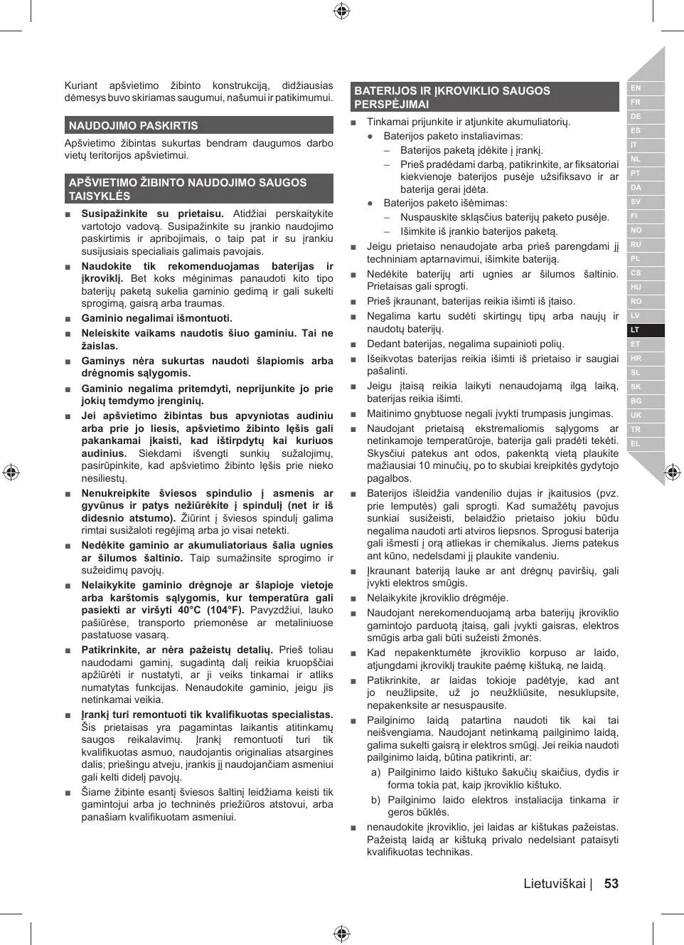 = Apprenez à connaître le produit. Lisez avec attention le manuel d'utilisation. Prenez connaissance des applications et des limitations de l'appareil ainsi que des risques potentiels spécifiques qui lui sont attachés. Utilisez uniquement la batterie et le chargeur fournis ou recommandés. Toute tentative d'utilisation d'un autre bloc de batterie endommagera le produit et serait susceptible de provoquer une explosion, un incendie, ou des blessures. Ne démontez pas le produit. Ne laissez aucun enfant utiliser le produit Ce n'est pas un jouet. Ce produit n'est pas conçu pour fonctionner dans des conditions humides ou mouillées. Ce produit n’est pas variable ; ne le connectez pas à des variateurs. Si le verre de la lampe de travail est enveloppé ou placé en contact avec un tissu, il est susceptible de produire suffisamment de chaleur pour faire fondre le tissu. Pour éviter toute blessure grave, ne laissez jamais le verre de la lampe de travail entrer en contact avec quoi que ce soit. Ne dirigez pas le faisceau de lumière sur les personnes et les animaux et ne regardez pas dans le faisceau vous-même (même à distance). Regarder le faisceau peut entraîner des lésions graves voire la perte de la vision. Ne posez pas le produit ou le bloc de batterie à proximité d'un feu ou d’une source de chaleur. Vous réduirez ainsi les risques d'explosion et de blessures. Ne stockez pas le produit dans un endroit humide ou mouillé, ou dans un endroit dont la température est susceptible d'atteindre ou de dépasser 40°C. Par exemple, dans une remise extérieure, un véhicule ou un bâtiment en tôle pendant l'été. Vérifiez qu'aucune pièce n'est endommagée. Avant toute utilisation prolongée du produit, une pièce endommagée doit être examinée prudemment afin de déterminer si elle va fonctionner correctement et comme prévu. N'utilisez pas le produit s’il ne fonctionne pas correctement. =_ Faites réparer votre outil par du personnel qualifié. Cet outil électrique est conforme aux normes légales de sécurité. Les réparations ne doivent être effectuées que par du personnel qualifié utilisant des pièces de rechange d'origine; dans le cas contraire, l'utilisateur s'exposerait à de graves dangers. = La source lumineuse contenue dans ce luminaire doit être remplacée uniquement pas le fabricant ou un de