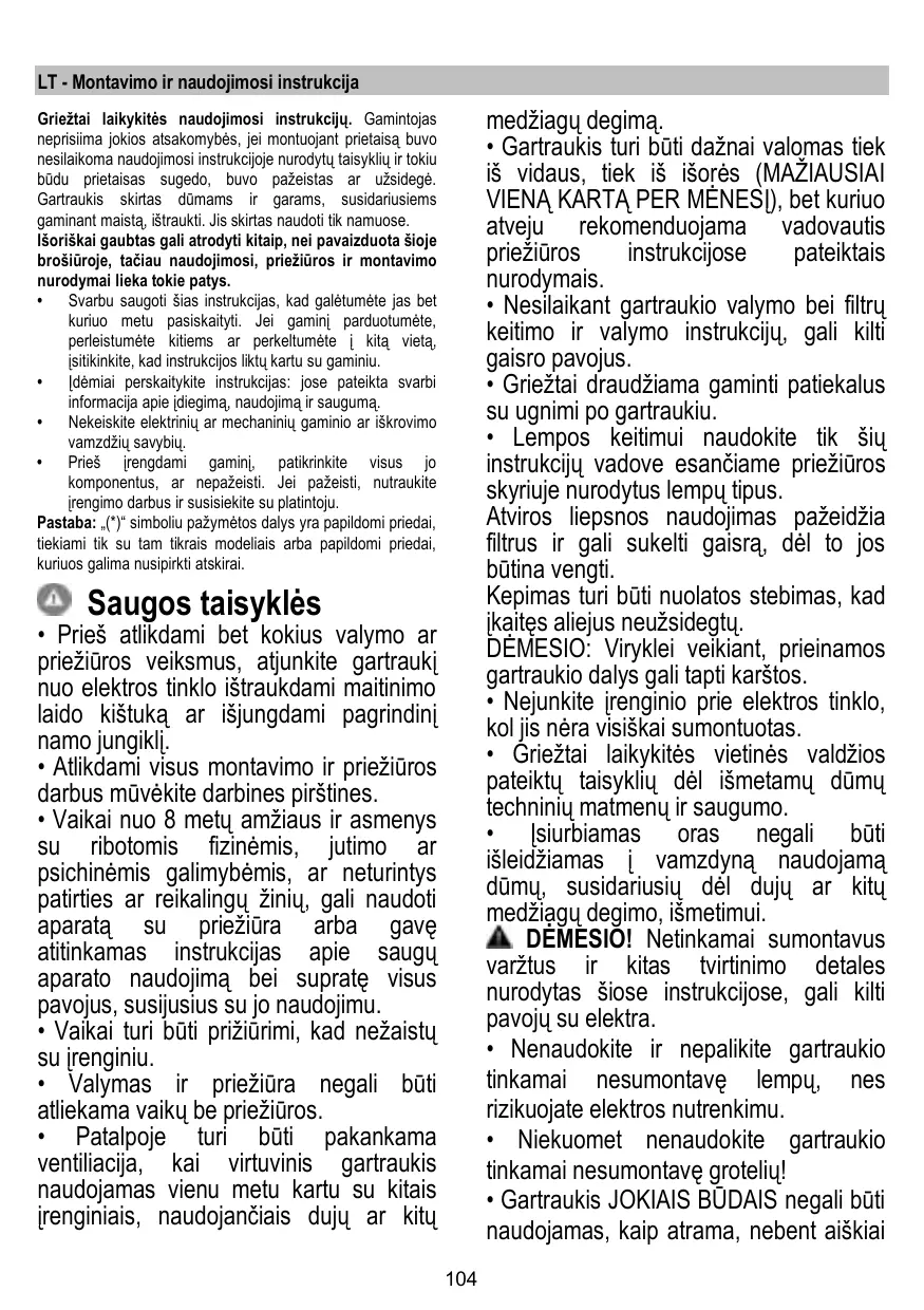 + La hotte ne doit JAMAIS être utilisée comme une surface d'appui, sauf indication expresse.