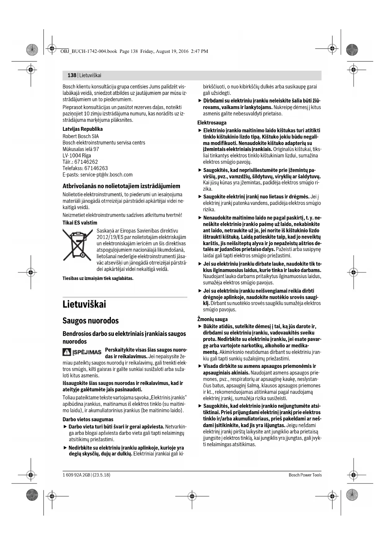 Svoris pagal „EPTA-Procedure 01:2014“ kg 6,8 Apsaugos klasė /II Duomenys galioja tik tada, kai nominalioji įtampa [U] 230 V. Jei įtampa kitokia arba jei naudojamas specialus, tam tikrai šaliai gaminamas mo-delis, šie duomenys gali skirtis. OBJ_BUCH-1742-004.book Page 140 Friday, August 19, 2016 2:47 PMLietuviškai | 141 Bosch Power Tools 1 609 92A 2GB | (23.5.18) Naudojimas Paruošimas naudoti Atkreipkite dėmesį į tinklo įtampą! Elektros tinklo įtampa turi atitikti elektrinio įrankio firminėje lentelėje nurodytą įtampą. 230 V pažymėtus elektrinius įrankius galima jungti ir į 220 V įtampos elektros tinklą. Veikimo režimo pasirinkimas Režimų perjungikliu 3 pasirinkite elektrinio įrankio veikimo re- žimą. Nuoroda: veikimo režimą keiskite tik tada, kai elektrinis prie- taisas išjungtas! Priešingu atveju galite pažeisti elektrinį prie- taisą. –Režimų perjungiklį 3 pasukite į pageidaujamą padėtį. Padėtyje „kirtimas“ reguliavimo ratuku 7 nustatytas smūgių skaičius įjungiant automatiškai padidinamas; todėl elektrinis įrankis kirsdamas veikia didesne galia. Įjungimas/išjungimas, esant gręžimo režimui Kad tausotumėte energiją, elektrinį įrankį įjunkite tik tada, kai naudosite. –Norėdami įjungti elektrinį įrankį, nuspauskite įjungimo-iš- jungimo jungiklį 5 ir laikykite jį nuspaustą. –Norėdami išjungti elektrinį įrankį, atleiskite įjungimo-iš- jungimo jungiklį 5. Įjungimas/išjungimas, esant kirtimo režimui Kad tausotumėte energiją, elektrinį įrankį įjunkite tik tada, kai naudosite. –Norėdami elektrinį įrankį įjungti, spauskite įjungimo-išjun- gimo jungiklį 5, esantį viršuje (I), kol jis užsifiksuos. –Norėdami elektrinį įrankį išjungti, paspauskite įjungimo- išjungimo jungiklį 5, esantį apačioje (0), ir atleiskite. Žemoje temperatūroje elektrinis įrankis visą smūgiavimo ir kalimo galią pasiekia tik po tam tikro laiko. Sūkių skaičiaus ir smūgių skaičiaus nustatymas Elektroninio reguliavimo sistema leidžia sklandžiai keisti sū- kių skaičių bei smūgių dažnį, atsižvelgiant į apdirbamą me- džiagą. Elektroninė sūkių stabilizavimo sistema išlaiko beveik pasto- vų pasirinktą sukimosi greitį ir smūgių dažnį, nepriklausomai nuo prietaisui tenkančios apkrovos dydžio. Įstatant kištuką į kištukinį lizdą arba dingus elektros srovei, elektroninis reguliatorius automatiškai nustato didžiausią sū- kių ir smūgių skaičių. Taip yra apsaugoma, kad dėl smūgių dažnio reguliatoriaus 7 išankstinio nustatymo į žemą padėtį nebūtų dirbama netinkama galia. –Reguliatoriaus ratuku 7 Pasirinkite apdirbamai medžiagai tinkamą smūgių dažnį. Duomenys žemiau pateiktoje lentelėje yra rekomendacinio pobūdžio. Apsauginė sankaba Įstrigus ar užsikabinus grąžtui, įsijungia apsauginė san- kaba, kuri išjungia jėgos perdavimą į suklį. Kadangi tuo metu prietaisą veikia reakcijos momentą sukeliančios jėgos, jį būtina patikimai laikyti abiem rankomis ir tvir- tai stovėti. Jei grąžtas įstrigo, būtina išjungti prietaisą ir išlaisvinti grąžtą. Įjungiant prietaisą su užblokuotu grąžtu atsi- randa didelis reakcijos jėgų momentas. Kalto padėties keitimas (Vario-Lock) Kaltas gali būti perstatomas ir užfiksuojamas 12 padėčių. Pa- sukus įrankį į norimą padėtį, su prietaisu galima dirbti pato- giausioje ir mažiausia varginančioje dirbančiojo kūną padėty- je. –Kaltą įstatykite į įrankių įtvarą. –Režimų perjungiklį 3 pasukite į padėtį „Vario-Lock“ (žr. „Veikimo režimo pasirinkimas“, 141 psl.). –Kaltą su įtvaru pasukite į norimą padėtį. –Režimų perjungiklį 3 pasukite į padėtį „Kirtimas“. Taip nu- stačius, įrankių įtvaras užfiksuojamas. Norint kirsti, režimų perjungiklis 3 visada turi būti nu- statytas į padėtį „Kirtimas“. Padėtis, norint gręžti su smūgiu. Jei įjungus darbo įrankis nepradeda iškart suktis, leiskite elektriniam įrankiui lėtai veikti, kol pradės suktis ir darbo įrankis. Padėtis Vario-Lock, norint pakeisti kalto pa- dėtį. Padėtis, norint kirsti Naudojimas Reguliavimo ratuko padė- tis Tinko ir lengvųjų statybinių medžiagų apdoro- jimas Plytelių nuėmimas Plytų apdorojimas Betono apdorojimas OBJ_BUCH-1742-004.book Page 141 Friday, August 19, 2016 2:47 PM142 | Lietuviškai 1 609 92A 2GB | (23.5.18) Bosch Power Tools Darbo patarimai Prieš atliekant bet kokius elektrinio įrankio reguliavi- mo ar priežiūros darbus reikia ištraukti kištuką iš elek- tros tinklo lizdo. Vibracijos slopintuvas Integruotas vibracijos slopintuvas sumažina vibraciją. Minkšta rankena saugo nuo nuslydimo, todėl elektrinis įrankis tvirčiau laikomas ir patogiau naudojamas. Priežiūra ir servisas Priežiūra ir valymas Prieš atliekant bet kokius elektrinio įrankio reguliavi- mo ar priežiūros darbus reikia ištraukti kištuką iš elek- tros tinklo lizdo. Reguliariai valykite elektrinį įrankį ir ventiliacines an- gas jo korpuse, tuomet galėsite dirbti kokybiškai ir sau- giai. Pažeistą apsauginį gaubtelį būtina nedelsiant pakeisti. Tai atlikti rekomenduojame remonto tarnyboje. Jei reikia pakeisti maitinimo laidą, dėl saugumo sumetimų tai turi būti atliekama Bosch įmonėje arba įgaliotose Bosch elek- trinių įrankių remonto dirbtuvėse. Techninės priežiūros indikatorius 8 Sudilus angliniams šepetėliams, prietaisas išsijungs savaime. Likus maždaug 8 valandoms iki savaiminio išsijungimo užsi- degs ar pradės mirkčioti priežiūros indikatoriaus lemputė 8. Tai reiškia, jog prietaisas turi būti pristatytas į serviso tarnybą techninei priežiūrai (adresus rasite skyrelyje „Klientų aptarna- vimo skyrius ir naudotojų konsultavimo tarnyba“). Parengties indikatorius 9 Kai kištukas įstatytas į lizdą ir yra tinklo įtampa, turi užsidegti parengties indikatorius 9. Jei degant parengties indikato