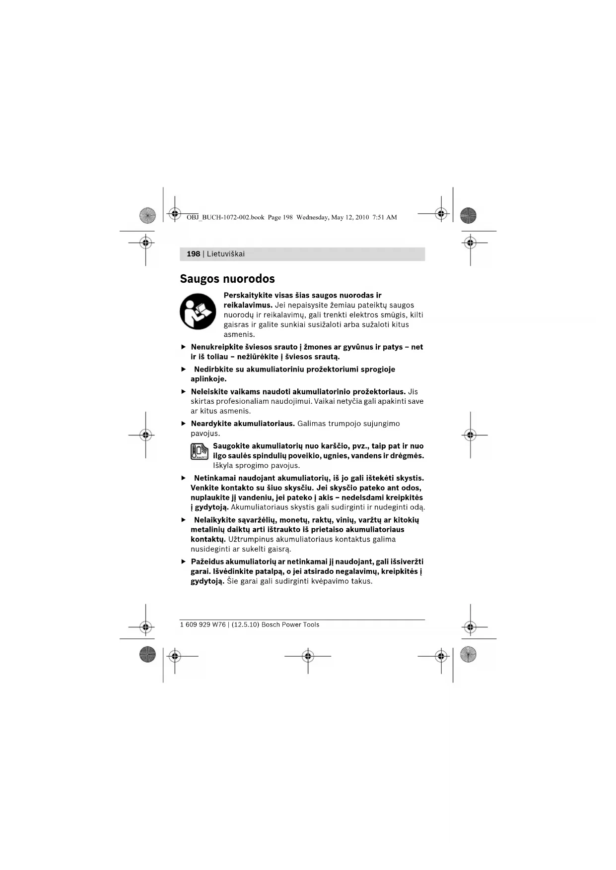 Saugos nuorodos Perskaitykite visas šias saugos nuorodas ir reikalavimus. Jei nepaisysite žemiau pateiktų saugos nuorodų ir reikalavimų, gali trenkti elektros smūgis, kilti gaisras ir galite sunkiai susižaloti arba sužaloti kitus asmenis. f Nenukreipkite šviesos srauto į žmones ar gyvūnus ir patys – net ir iš toliau – nežiūrėkite į šviesos srautą. f Nedirbkite su akumuliatoriniu prožektoriumi sprogioje aplinkoje. f Neleiskite vaikams naudoti akumuliatorinio prožektoriaus. Jis skirtas profesionaliam naudojimui. Vaikai netyčia gali apakinti save ar kitus asmenis. f Neardykite akumuliatoriaus. Galimas trumpojo sujungimo pavojus. Saugokite akumuliatorių nuo karščio, pvz., taip pat ir nuo ilgo saulės spindulių poveikio, ugnies, vandens ir drėgmės. Iškyla sprogimo pavojus. f Netinkamai naudojant akumuliatorių, iš jo gali ištekėti skystis. Venkite kontakto su šiuo skysčiu. Jei skysčio pateko ant odos, nuplaukite jį vandeniu, jei pateko į akis – nedelsdami kreipkitės į gydytoją. Akumuliatoriaus skystis gali sudirginti ir nudeginti odą. f Nelaikykite sąvaržėlių, monetų, raktų, vinių, varžtų ar kitokių metalinių daiktų arti ištraukto iš prietaiso akumuliatoriaus kontaktų. Užtrumpinus akumuliatoriaus kontaktus galima nusideginti ar sukelti gaisrą. f Pažeidus akumuliatorių ar netinkamai jį naudojant, gali išsiveržti garai. Išvėdinkite patalpą, o jei atsirado negalavimų, kreipkitės į gydytoją. Šie garai gali sudirginti kvėpavimo takus. OBJ_BUCH-1072-002.book Page 198 Wednesday, May 12, 2010 7:51 AMLietuviškai | 199 Bosch Power Tools 1 609 929 W76 | (12.5.10) f Akumuliatoriui įkrauti naudokite tik tuos įkroviklius, kuriuos rekomenduoja gamintojas. Naudojant kitokio tipo akumuliato- riams skirtą įkroviklį, iškyla gaisro pavojus. f Akumuliatorių naudokite tik su Jūsų Bosch elektriniu įrankiu. Tik taip apsaugosite akumuliatorių nuo pavojingos per didelės apkrovos. f Naudokite tik originalius Bosch akumuliatorius, kurių įtampa atitinka jūsų elektrinio įrankio firminėje lentelėje nurodytą įtampą. Kitokie akumuliatoriai, pvz., perdirbti akumuliatoriai, gaminių imitacijos ar kitų gamintojų akumuliatoriai, naudojami gali sprogti, sužeisti žmones ir padaryti turtinės žalos. Funkcijų aprašymas Elektrinio įrankio paskirtis Akumuliatorinis prožektorius skirtas apšviesti sausoje patalpoje, laikant jį rankose. Pavaizduoti prietaiso elementai Pavaizduotų prietaiso dalių numeriai atitinka akumuliatorinio prožektoriaus schemos numerius. 1 Prožektoriaus galvutė 2 Įjungimo-išjungimo jungiklis 3 Akumuliatorius* 4 Akumuliatoriaus atblokavimo klavišas 5 Laikiklis tvirtinti prie diržo *Pavaizduoti ar aprašyti priedai į tiekiamą standartinį komplektą neįeina. Visą papildomą įrangą rasite mūsų papildomos įrangos programoje. OBJ_BUCH-1072-002.book Page 199 Wednesday, May 12, 2010 7:51 AM1 609 929 W76 | (12.5.10) Bosch Power Tools 200 | Lietuviškai Techniniai duomenys Montavimas Akumuliatoriaus įkrovimas (pap. įranga) (žiūr. pav. A) f Naudokite tik priedų puslapyje nurodytus kroviklius. Tik šie krovikliai yra priderinti prie jūsų akumuliatoriniame prožektoriuje naudojamo ličio jonų akumuliatoriaus. Nuoroda: akumuliatorius tiekiamas iš dalies įkrautas. Kad akumuliatorius veiktų visa galia, prieš pirmąjį naudojimą akumuliatorių kroviklyje visiškai įkraukite. Ličio jonų akumuliatorių galima įkrauti bet kada, eksploatavimo trukmė dėl to nesutrumpėja. Krovimo proceso nutraukimas akumuliatoriui nekenkia. Ličio jonų akumuliatoriuose esanti „Akumuliatoriaus celių apsaugos sistema (ECP)“ saugo juos nuo visiškos iškrovos. Kai akumuliatorius išsikrauna, apsauginis išjungiklis išjungia akumuliatorinį prožektorių. Akumuliatorinis prožektorius GLI 10,8 V-LI Professional Gaminio numeris 3 601 D37 U.. Nominalioji įtampa V= 10,8 Švietimo trukmė apie min 450 Darbinė temperatūra °C –10 ... +40 Sandėliavimo temperatūra °C –15 ... +50 Svoris pagal „EPTA-Procedure 01/2003“ kg 0,3 Prašome atkreipti dėmesį į jūsų akumuliatorinio prožektoriaus firminėje lentelėje nurodytą gaminio numerį. Kai kurių akumuliatorinių prožektorių pre- kybiniai pavadinimai gali skirtis. OBJ_BUCH-1072-002.book Page 200 Wednesday, May 12, 2010 7:51 AMLietuviškai | 201 Bosch Power Tools 1 609 929 W76 | (12.5.10) Jei akumuliatorinis prožektorius išjungiamas automatiškai, įjungimo-išjungimo jungiklio nebespauskite. Priešingu atveju galite pažeisti akumuliatorių. Norėdami išimti akumuliatorių 3, spauskite akumuliatoriaus atblokavimo klavišą 4 ir traukite akumuliatorių atgal iš akumuliatorinio prožektoriaus. Traukdami nenaudokite jėgos. Akumuliatorius turi NTC temperatūros kontrolės daviklį, kuris leidžia įkrauti akumuliatorių tik tuomet, kai jo temperatūra yra tarp 0 °C ir 45 °C. Tai gerokai pailgina akumuliatoriaus naudojimo laiką. Vadovaukitės pateiktomis nuorodomis dėl prietaiso ir akumuliato- riaus šalinimo. Naudojimas Paruošimas naudoti Akumuliatoriaus įdėjimas f Naudokite tik originalius Bosch ličio jonų akumuliatorius, kurių įtampa atitinka jūsų akumuliatorinio prožektoriaus firminėje lentelėje nurodytą įtampą. Naudojant kitokius akumuliatorius iškyla pavojus susižeisti ir sukelti gaisrą. Įstatykite įkrautą akumuliatorių 3 į rankeną ir įstumkite, kol jis juntamai užsifiksuos ir nebebus išsikišęs iš rankenos. Įjungimas ir išjungimas f Akumuliatorinis prožektorius sukuria šviesos srautą, kuris eina iš prožektoriaus galvutės 1. Norėdami akumuliatorinį prožektorių įjungti, paspauskite įjungimo- išjungimo jungiklį 2. Norėdami akumuliatorinį prožektorių išjungti, įjungimo-išjungimo jungiklį 2 paspauskite dar kartą. DĖMESIO OBJ_BUCH-1072-002.book Page 201 Wednesday, May 12, 2010 7:51 AM1 609 929 W76 | (12.5.10) Bosch Power Tools 202 | Lietuviškai Apsauga nuo visiškos iškrovos Liči