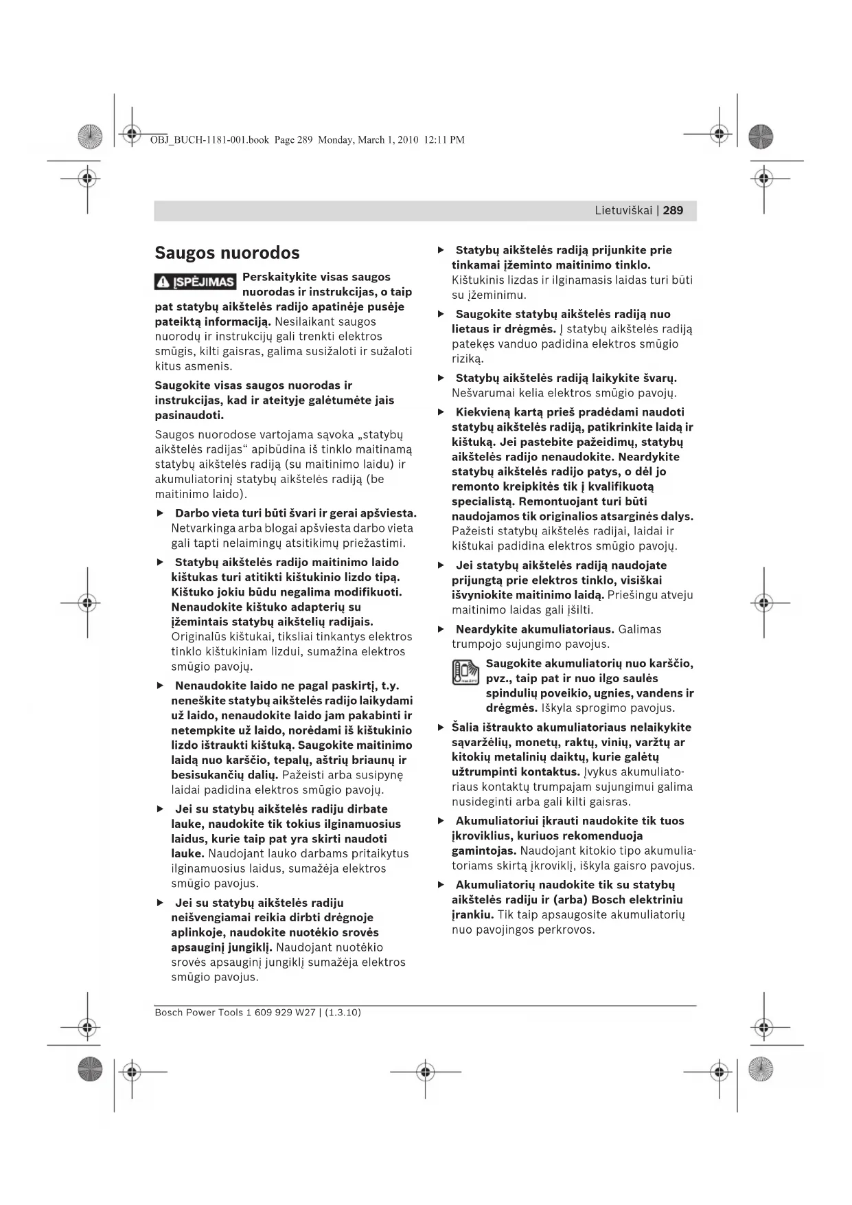 Įstatykite saugiklį 32 Įsijungė saugiklis 32 Saugiklį 32 pakeiskite Įsijungė vidinis temperatūros saugiklis Išimkite išorinį prietaisą ir palaukite, kol statybņ aikštelės radijas atvės OBJ_BUCH-1181-001.book Page 297 Monday, March 1, 2010 12:11 PM298 | Lietuviškai 1 609 929 W27 | (1.3.10) Bosch Power Tools Nepašalinus gedimo aukščiau aprašytomis priemonėmis, reikia kreiptis į įgaliotą Bosch klientņ aptarnavimo skyriņ. Priežiūra ir servisas Priežiūra ir valymas f Maitinimo laidas yra su specialia apsaugine jungtimi, jį gali keisti tik Bosch įgalioto klientų aptarnavimo skyriaus specialistai. Jei, nepaisant kruopščios gamybos ir patikrinimo, statybņ aikštelės radijas sugestņ, jo remontas turi būti atliekamas įgaliotose BOSCH elektriniņ įrankiņ remonto dirbtuvėse. Ieškant informacijos ir užsakant atsargines dalis prašome būtinai nurodyti dešimtženklį gaminio numerį, esantį statybņ aikštelės radijo firminėje lentelėje. Klientų aptarnavimo skyrius ir klientų konsultavimo tarnyba Klientņ aptarnavimo skyriuje gausite atsakymus į klausimus, susijusius su jūsņ gaminio remontu, technine priežiūra bei atsarginėmis dalimis. Detalius brėžinius ir informaciją apie atsargines dalis rasite čia: www.bosch-pt.com Bosch klientņ konsultavimo tarnybos specialis- tai mielai jums patars gaminiņ ir papildomos įrangos pirkimo, naudojimo bei nustatymo klau- simais. Lietuva Bosch įrankiņ servisas Informacijos tarnyba: +370 (037) 713350 ļrankiņ remontas: +370 (037) 713352 Faksas: +370 (037) 713354 El. paštas: service-pt@lv.bosch.com Transportavimas Akumuliatorius siņskite tik tada, jei nepažeistas korpusas. Apklijuokite kontaktus ir supakuokite akumuliatoriņ taip, kad jis pakuotėje nejudėtņ. Siunčiant ličio jonņ akumuliatorius gali būti privalomas ypatingas ženklinimas. Laikykitės galiojančiņ nacionaliniņ taisykliņ. Statybų aikštelės radijas staiga nustojo veikti Netinkamai arba nevisiškai įstatytas tinklo kištukas ar akumuliatorius. Tinkamai ar visiškai įstatykite tinklo kiš- tuką ar akumuliatoriņ Programinės įrangos neveiktis Norėdami atlikti programinės įrangos atstatą, ištraukite tinklo kištuką ar išimkite akumulia- toriņ, palaukite 30 s ir vėl įstatykite tinklo kištuką ar įdėkite akumuliatoriņ. Blogai priimamos radijo bangos Trikdo kiti prietaisai arba netinkama pastatymo vieta Statybņ aikštelės radiją pastatykite kitoje vietoje, kurioje yra geresnis radijo bangņ priėmimas Netinkamai nukeipta strypinė antena Pasukite strypinę anteną Su trikdžiais rodomas laikas Išsikrovusi laiko indikatoriaus buferinė baterija Pakeiskite buferines baterijas Buferinės baterijos įdėtos netinkamai nustačius polius Buferines baterijas įdėkite tinkamai nustatę polius Priežastis Pašalinimas OBJ_BUCH-1181-001.book Page 298 Monday, March 1, 2010 12:11 PMLietuviškai | 299 Bosch Power Tools 1 609 929 W27 | (1.3.10) Šalinimas Statybņ aikštelės radijas, papildoma įranga ir pakuotės turi būti perdirbami aplinkai nekenksmingu būdu. Tik ES šalims: Nemeskite statybņ aikštelės radijo į buitiniņ atliekņ konteinerius! Pagal Europos direktyvą 2002/96/EB dėl elektros ir elek- troninės įrangos atliekņ ir šios direktyvos perkėlimo į nacionalinę teisę aktus, naudoti nebetinkami elektriniai įrankiai ir elektroniniai prietaisai arba akumulia- toriai turi būti surenkami atskirai ir perdirbami aplinkai nekenksmingu būdu. Akumuliatoriai ir baterijos Ličio jonų: Prašome laikytis skyriuje „Transportavimas“, psl. 298 pateiktņ nuorodņ. Nemeskite akumuliatoriņ ir baterijņ į buitiniņ at- liekņ konteinerius, ugnį ar vandenį. Akumuliato- riai ir baterijos turi būti surenkamos ir perdirba- mos arba šalinamos nekenkiant aplinkai. Tik ES šalims: Susidėvėję akumuliatoriai ir akumuliatoriai su defektais turi būti perdirbti pagal Direktyvos 2006/66/EB reikalavimus. Galimi pakeitimai. OBJ_BUCH-1181-001.book Page 299 Monday, March 1, 2010 12:11 PM1 609 929 W27 | (1.3.10) Bosch Power Tools 300 |