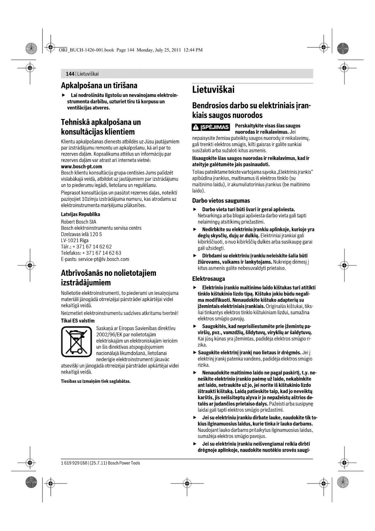 Jei su elektriniu jrankiu dirbate lauke, naudokite tik tokius ilginamuosius laidus, kurie tinka ir lauko darbams. Naudojant lauko darbams pritaikytus ilginamuosius laidus,sumazeja elektros smugio pavojus.
