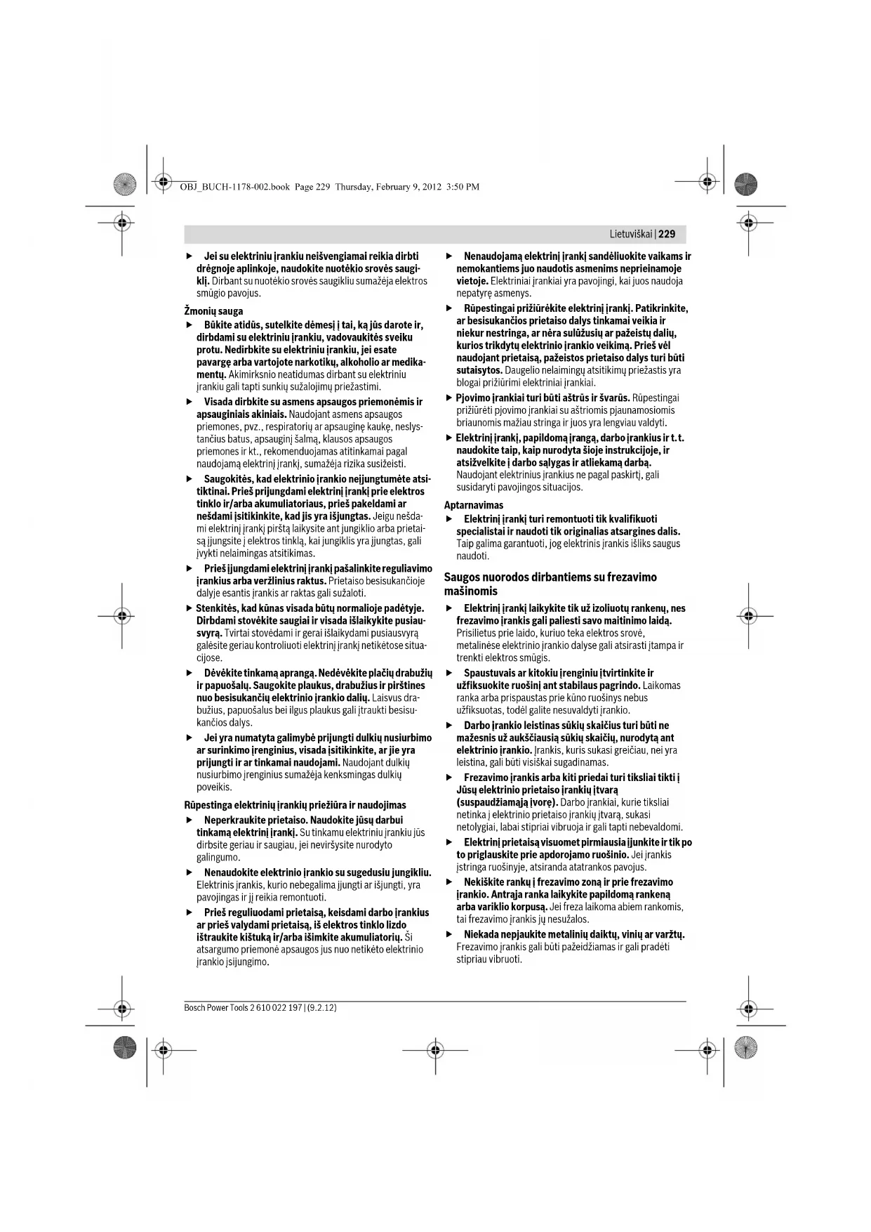 Frēzēšana, lietojot uzsūkšanas pārsegu (attēli T–U) Veicot malu apstrādi, var lietot uzsūkšanas pārsegu 59. – Nostipriniet uzsūkšanas pārsegu 59 ar 2 skrūvēm 60 uz pamatnes 13. Uzsūkšanas pārsegu 59 var nostiprināt 3 dažādos stāvokļos, kā parādīts attēlā. – Apstrādājot gludas, plakanas virsmas, noņemiet uzsūkšanas pārsegu. Apkalpošana un apkope Apkalpošana un tīrīšana f Pirms elektroinstrumenta apkopes vai apkalpošanas izvelciet tā elektrokabeļa kontaktdakšu no barojošā elektrotīkla kontaktligzdas. f Lai nodrošinātu ilgstošu un nevainojamu elektroin- strumenta darbību, uzturiet tīru tā korpusu un ventilācijas atveres. OBJ_BUCH-1178-002.book Page 227 Thursday, February 9, 2012 3:50 PM228 | Lietuviškai 2 610 022 197 | (9.2.12) Bosch Power Tools f Strādājot ekstremālos apstākļos vienmēr izmantojiet putekļu uzsūkšanas ierīci, ja vien tas ir iespējams. Pēc iespējas biežāk izpūtiet elektroinstrumenta ventilācijas atveres ar saspiestu gaisu un pievienojiet to elektrotīklam caur noplūdes strāvas (FI-) aizsargre- leju. Izmantojot elektroinstrumentu metāla apstrādei, tā korpusa iekšpusē var uzkrāties strāvu vadoši putekļi. Tas var nelabvēlīgi ietekmēt elektroinstrumenta aizsargizolāci- jas sistēmu. Ja nepieciešams nomainīt elektrotīkla kabeli, tas jāveic firmas Bosch elektroinstrumentu servisa centrā vai Bosch pilnvarotā elektroinstrumentu remonta darbnīcā, jo tā tiks saglabāts vajadzīgais darba drošības līmenis. Ja, neraugoties uz augsto izgatavošanas kvalitāti un rūpīgo pēcražošanas pārbaudi, elektroinstruments tomēr sabojājas, tas nogādājams remontam firmas Bosch pilnvarotā elektroinstrumentu remonta darbnīcā. Pieprasot konsultācijas un pasūtot rezerves daļas, noteikti paziņojiet 10zīmju izstrādājuma numuru, kas atrodams uz elektroinstrumenta marķējuma plāksnītes. Tehniskā apkalpošana un konsultācijas klientiem Klientu apkalpošanas dienests atbildēs uz Jūsu jautājumiem par izstrādājumu remontu un apkalpošanu, kā arī par to rezerves daļām. Kopsalikuma attēlus un informāciju par rezerves daļām var atrast arī interneta vietnē: www.bosch-pt.com Bosch klientu konsultāciju grupa centīsies Jums palīdzēt vislabākajā veidā, atbildot uz jautājumiem par izstrādājumu un to piederumu iegādi, lietošanu un regulēšanu. Latvijas Republika Robert Bosch SIA Bosch elektroinstrumentu servisa centrs Dzelzavas ielā 120 S LV-1021 Rīga Tālr.: + 371 67 14 62 62 Telefakss: + 371 67 14 62 63 E-pasts: service-pt@lv.bosch.com Atbrīvošanās no nolietotajiem izstrādājumiem Nolietotie elektroinstrumenti, to piederumi un iesaiņojuma materiāli jānogādā otrreizējai pārstrādei apkārtējai videi nekaitīgā veidā. Neizmetiet elektroinstrumentu sadzīves atkritumu tvertnē! Tikai ES valstīm Saskaņā ar Eiropas Savienības direktīvu 2002/96/EK par nolietotajām elektriskajām un elektroniskajām ierīcēm un šīs direktīvas atspoguļojumiem nacionālajā likumdošanā, lietošanai nederīgie elektroinstrumenti jāsavāc atsevišķi un jānogādā otrreizējai pārstrādei apkārtējai videi nekaitīgā veidā. Tiesības uz izmaiņām tiek saglabātas. Lietuviškai Saugos nuorodos Bendrosios darbo su elektriniais įrankiais saugos nuorodos Perskaitykite visas šias saugos nuorodas ir reikalavimus. Jei nepaisysite žemiau pateiktų saugos nuorodų ir reikalavimų, gali trenkti elektros smūgis, kilti gaisras ir galite sunkiai susižaloti arba sužaloti kitus asmenis. Išsaugokite šias saugos nuorodas ir reikalavimus, kad ir ateityje galėtumėte jais pasinaudoti. Toliau pateiktame tekste vartojama sąvoka „Elektrinis įrankis“ apibūdina įrankius, maitinamus iš elektros tinklo (su maitinimo laidu), ir akumuliatorinius įrankius (be maitinimo laido). Darbo vietos saugumas f Darbo vieta turi būti švari ir gerai apšviesta. Netvarkinga arba blogai apšviesta darbo vieta gali tapti nelaimingų atsitikimų priežastimi. f Nedirbkite su elektriniu įrankiu aplinkoje, kurioje yra degių skysčių, dujų ar dulkių. Elektriniai įrankiai gali kibirkščiuoti, o nuo kibirkščių dulkės arba susikaupę garai gali užsidegti. f Dirbdami su elektriniu įrankiu neleiskite šalia būti žiūrovams, vaikams ir lankytojams. Nukreipę dėmesį į kitus asmenis galite nebesuvaldyti prietaiso. Elektrosauga f Elektrinio įrankio maitinimo laido kištukas turi atitikti tinklo kištukinio lizdo tipą. Kištuko jokiu būdu negali- ma modifikuoti. Nenaudokite kištuko adapterių su įžemintais elektriniais įrankiais. Originalūs kištukai, tiks- liai tinkantys elektros tinklo kištukiniam lizdui, sumažina elektros smūgio pavojų. f Saugokitės, kad neprisiliestumėte prie įžemintų pa- viršių, pvz., vamzdžių, šildytuvų, viryklių ar šaldytuvų. Kai jūsų kūnas yra įžemintas, padidėja elektros smūgio ri- zika. f Saugokite elektrinį įrankį nuo lietaus ir drėgmės. Jei į elektrinį įrankį patenka vandens, padidėja elektros smūgio rizika. f Nenaudokite maitinimo laido ne pagal paskirtį, t.y. ne- neškite elektrinio įrankio paėmę už laido, nekabinkite ant laido, netraukite už jo, jei norite iš kištukinio lizdo ištraukti kištuką. Laidą patieskite taip, kad jo neveiktų karštis, jis neišsiteptų alyva ir jo nepažeistų aštrios de- talės ar judančios prietaiso dalys. Pažeisti arba susipynę laidai gali tapti elektros smūgio priežastimi. f Jei su elektriniu įrankiu dirbate lauke, naudokite tik to- kius ilginamuosius laidus, kurie tinka ir lauko darbams. Naudojant lauko darbams pritaikytus ilginamuosius laidus, sumažėja elektros smūgio pavojus. OBJ_BUCH-1178-002.book Page 228 Thursday, February 9, 2012 3:50 PMLietuviškai | 229 Bosch Power Tools 2 610 022 197 | (9.2.12) f Jei su elektriniu įrankiu neišvengiamai reikia dirbti drėgnoje aplinkoje, naudokite nuotėkio srovės saugi- klį. Dirbant su nuotėkio srovės sa