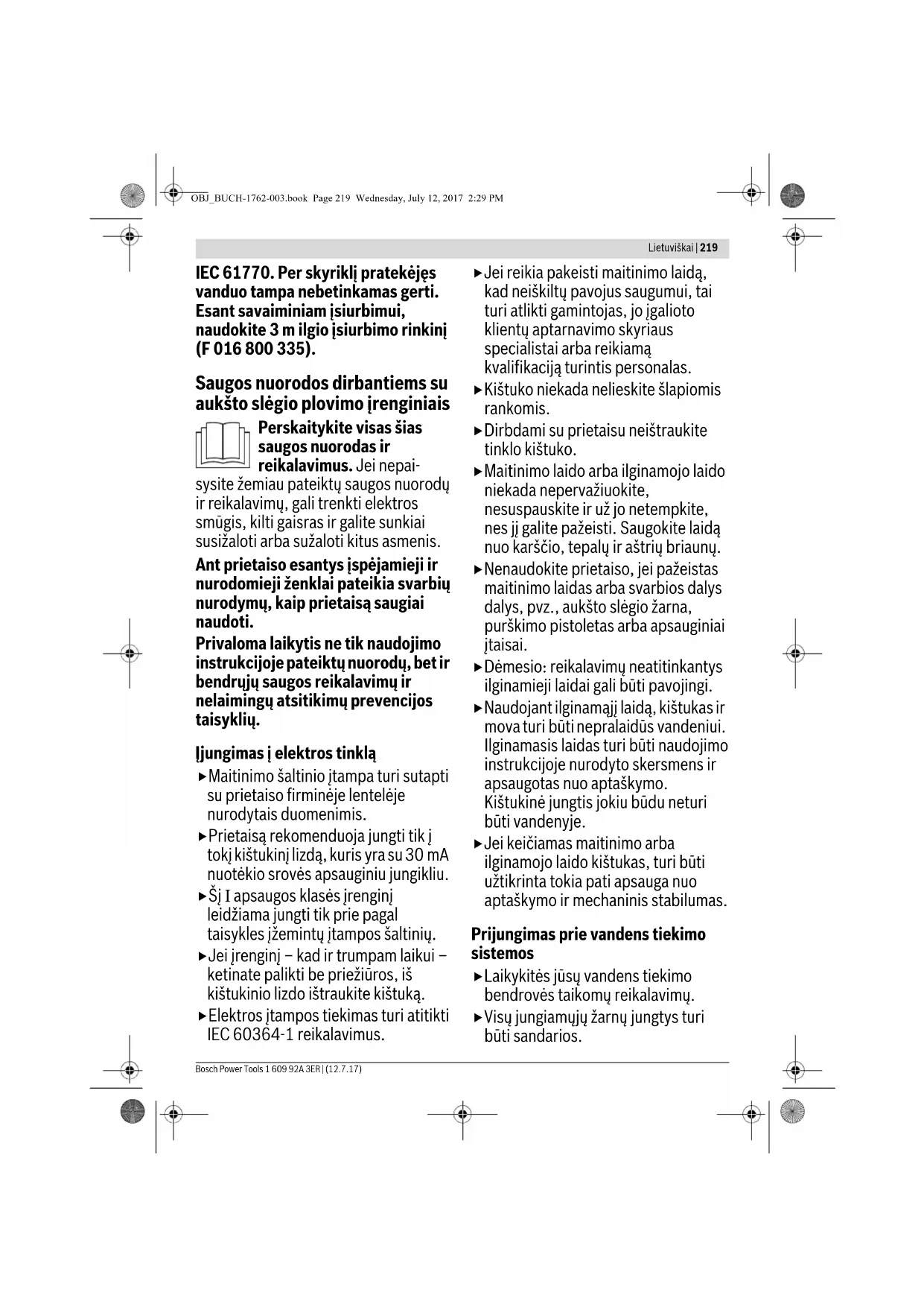 OBJ_BUCH-1762-003.book Page 223 Wednesday, July 12, 2017 2:29 PM224 | Lietuviškai 1 609 92A 3ER | (12.7.17) Bosch Power Tools Nuorodos gaminiams, kurie parduodami ne DB: DĖMESIO: siekiant užtikrinti jūsų saugumą reikia, kad prie sodo priežiūros įrankio pritvirtintas kištukas būtų sujungtas su ilginamuoju laidu. Ilginamojo laido jungtis turi būti apsaugota nuo aptaškymo, pagaminta iš gumos arba aptraukta guma. Ilginamasis laidas turi būti su laido įtempimo sumažinimo įtaisu. Vandens įsiurbimas iš atvirų rezervuarų – Prie vandens tiekimo jungties prisukite siurbimo žarną su filtru (specialus siurbimo žarnos rinkinys, gam. Nr. F 016 800 335). – Įjunkite įrenginį, esant nustatytam žemam slėgiui. – Tada leiskite į renginiui veikti apie 10 sekundžių ir jį išjunkite. Šiuos veiksmus pakartokite kelis kartus, kol vanduo pradės tekėti tolygia srove ir be burbulėlių. Įsidėmėkite, kad šį įrenginį be vandens eksploatuoti draudžiama. Naudojimas Įjungimas Vandens žarną (netiekiama kartu) prijunkite prie vandens čiaupo ir prie prietaiso. Patikrinkite, ar tinklo jungiklis yra padėtyje „0“, ir įkiškite prietaiso kištuką į kištukinį lizdą. Atsukite vandens čiaupą. Nuspauskite įjungimo blokatorių ir atblokuokite gaiduką . Gaiduką laikykite visiškai nuspaudę, kol vanduo pradės tekėti tolygia srove ir prietaise bei aukšto slėgio žarnoje neliks oro. Gaiduką atleiskite. Purškimo pistoletą nukreipkite žemyn. Nuspauskite įjungimo blokatorių ir atblokuokite gaiduką . Gaiduką nuspauskite iki galo. Paspauskite įjungimo-išjungimo jungiklį. Automatinio sustabdymo funkcija Įrenginys išjungia variklį, kai tik atleidžiamas ant pistoleto rankenos esantis paleidiklis. Darbo patarimai Bendrosios nuorodos Patikrinkite, ar aukšto slėgio plovimo įrenginys stovi ant lygaus pagrindo. Nenueikite su aukšto slėgio žarna per daug į priekį ir netraukite aukšto slėgio plovimo įrenginio už žarnos. Priešingu atveju aukšto slėgio plovimo įrenginys gali prarasti stabilumą ir apvirsti. Aukšto slėgio žarnos nesulenkite ir nepervažiuokite per ją su transporto priemone. Saugokite aukšto slėgio žarną nuo aštrių kraštų ir kampų. Nenaudokite rotacinio purškimo antgalio automobiliams plauti. Nedarykite jokių draudžiamų apsauginio vožtuvo pakeitimų ir jo nereguliuokite. Darbo patarimai naudojant plovimo priemones Naudokite tik tokias valymo priemones, kurios yra skirtos aukšto slėgio plovimo renginiams. Dėl aplinkos apsaugos valymo priemonę rekomenduojame naudoti taupiai. Laikykitės ant bakelio pateiktų skiedimo rekomendacijų. Bosch užtikrina, kad naudojant nurodytas valymo ir konservavimo priemones prietaisas veiks be trikdžių. Rekomenduojamas plovimo būdas 1 žingsnis: nešvarumų atmirkymas Taupiai užpurkškite valymo priemonės ir šiek tiek palaukite, kol įsigers. 2 žingsnis: nešvarumų šalinimas Atmirkusius nešvarumus nuplaukite aukšto slėgio srove. Nuoroda: plaudami vertikalius paviršius, nešvarumų šalinimo/plovimo priemonę purkškite iš apačios ir kilkite į viršų. Priemonę nuplaudami, purkškite iš viršaus į apačią. Gedimų nustatymas Požymiai Galima priežastis Pašalinimas Variklis neužsiveda Neįkištas kištukas Įkiškite kištuką Sugedęs kištukinis lizdas Naudokitės kitu kištukiniu lizdu Suveikė saugiklis Pakeiskite saugiklį Pažeistas ilginamasis laidas Pabandykite įjungti be ilginamojo laido Įsijungė variklio apsauginis įtaisas 15 min palaukite, kol variklis atvės Užšalo Palaukite, kol atšils siurblys, vandens žarna arba purškimo antgalis Sustoja variklis Suveikė saugiklis Pakeiskite saugiklį Netinkama tinklo įtampa Patikrinkite tinklo įtampą, ji turi atitikti firminėje lentelėje pateiktus duomenis Įsijungė variklio apsauginis įtaisas 15 min palaukite, kol variklis atvės OBJ_BUCH-1762-003.book Page 224 Wednesday, July 12, 2017 2:29 PMLietuviškai | 225 Bosch Power Tools 1 609 92A 3ER | (12.7.17) Suveikia saugiklis Per silpnas saugiklis Įjunkite į elektros grandinę, kurios saugiklis atitinka aukšto slėgio plovimo įrenginio galingumą Variklis veikia, bet nėra slėgio Iš dalies užsikimšęs purškimo antgalis Išvalykite purškimo antgalį Variklis skleidžia triukšmą, bet neveikia Nepakankama tinklo įtampa Patikrinkite, ar elektros tinklo įtampa atitinka firminėje lentelėje pateiktus duomenis Per žema įtampa, nes naudojamas ilginamasis laidas Patikrinkite, ar naudojamas tinkamas ilginamasis laidas Įrenginys ilgai nebuvo naudojamas Kreipkitės į įgaliotą Bosch klientų aptarnavimo skyrių Problemos su automatinio sustabdymo funkcija Kreipkitės į įgaliotą Bosch klientų aptarnavimo skyrių Pulsuojantis slėgis Vandens žarnoje arba siurblyje yra oro Aukšto slėgio plovimo įrenginiui leiskite veikti su atidarytu purškimo pistoletu, atsuktu vandens čiaupu ir ties žemu slėgiu nustatytu antgaliu, kol slėgis taps tolygus Netinkamas vandens tiekimas Patikrinkite, ar prie vandens tiekimo sistemos prijungta pagal techninių duomenų skyriuje pateiktus duomenis. Leidžiama naudoti ne mažesnio kaip 1/2" arba Ø 13 mm skersmens vandens žarnas Užsikimšęs vandens filtras Išvalykite vandens filtrą Suspausta arba užlenkta vandens žarna Ištiesinkite vandens žarną Aukšto slėgio žarna per ilga Atjunkite aukšto slėgio žarnos ilginamąją dalį, vandens žarnos maks. ilgis 7 m Slėgis tolygus, bet per žemas Nuoroda: tam tikri papildomi antgaliai sąlygoja žemesnį slėgį Susidėvėjęs purškimo antgalis Pakeiskite purškimo antgalį Susidėvėjęs paleidimo ir sustabdymo vožtuvas 5 kartus iš eilės greitai paspauskite gaiduką Variklis veikia, bet slėgis ribotas arba nėra darbinio slėgio Neprijungta prie vandens tiekimo šaltinio Prijunkite prie vandens tiekimo šaltinio Užsikimšęs filtras Išvalykite filtrą Užsikimšęs purškimo antgalis Išvalykite purškimo antgalį Aukšto slėgio plovim
