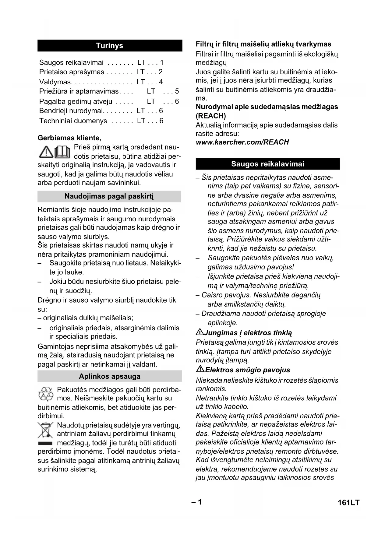 - Nedarbojas elektrības vada ievilkšanas mehānisms Vāja sūkšana Vispārējas piezīmes Garantija Klientu apkalpošanas centrs Rezerves detaļu un speciālo piederumu pasūtīšana Tehniskie dati Spriegums Jauda P nom Jauda P maks Aparāta kontaktligzdas maks. pie- slēguma jauda Tīkla drošinātājs (kūstošais) Tvertnes tilpums Ar rokturi uzņemamais ūdens dau- dzums Ar grīdas tīrīšanas sprauslu uzņe- mamais ūdens daudzums Tīkla kabelis Skaņas spiediena līmenis (EN 60704-2-1) Svars (bez pierīcēm) 160 LVLietuviškai – 1 Gerbiamas kliente, Prieš pirmą kartą pradedant nau- dotis prietaisu, būtina atidžiai per- skaityti originalią instrukciją, ja vadovautis ir saugoti, kad ja galima būtų naudotis vėliau arba perduoti naujam savininkui. Remiantis šioje naudojimo instrukcijoje pa- teiktais aprašymais ir saugumo nurodymais prietaisas gali būti naudojamas kaip drėgno ir sauso valymo siurblys. Šis prietaisas skirtas naudoti namų ūkyje ir nėra pritaikytas pramoniniam naudojimui. – Saugokite prietaisą nuo lietaus. Nelaikyki- te jo lauke. – Jokiu būdu nesiurbkite šiuo prietaisu pele- nų ir suodžių. Drėgno ir sauso valymo siurblį naudokite tik su: – originaliais dulkių maišeliais; – originaliais priedais, atsarginėmis dalimis ir specialiais priedais. Gamintojas neprisiima atsakomybės už gali- mą žalą, atsiradusią naudojant prietaisą ne pagal paskirtį ar netinkamai jį valdant. Pakuotės medžiagos gali būti perdirba- mos. Neišmeskite pakuočių kartu su buitinėmis atliekomis, bet atiduokite jas per- dirbimui. Naudotų prietaisų sudėtyje yra vertingų, antriniam žaliavų perdirbimui tinkamų medžiagų, todėl jie turėtų būti atiduoti perdirbimo įmonėms. Todėl naudotus prietai- sus šalinkite pagal atitinkamą antrinių žaliavų surinkimo sistemą. Filtrai ir filtrų maišeliai pagaminti iš ekologiškų medžiagų Juos galite šalinti kartu su buitinėmis atlieko- mis, jei į juos nėra įsiurbti medžiagų, kurias šalinti su buitinėmis atliekomis yra draudžia- ma. Nurodymai apie sudedamą sias medžiagas (REACH) Aktualią informaciją apie sudedamąsias dalis rasite adresu: www.kaercher.com/REACH – Šis prietaisas nepritaikytas naudoti asme- nims (taip pat vaikams) su fizine, sensori- ne arba dvasine negalia arba asmenims, neturintiems pakankamai reikiamos patir- ties ir (arba) žinių, nebent prižiūrint už saugą atsakingam asmeniui arba gavus šio asmens nurodymus, kaip naudoti prie- taisą. Prižiūrėkite vaikus siekdami užti- krinti, kad jie nežaistų su prietaisu. – Saugokite pakuotės plėveles nuo vaikų, galimas uždusimo pavojus! – Išjunkite prietaisą prieš kiekvieną naudoji- mą ir valymą/techninę priežiūrą. – Gaisro pavojus. Nesiurbkite degančių arba smilkstančių daiktų. – Draudžiama naudoti prietaisą sprogioje aplinkoje. 몇 Jungimas į elektros tinklą Prietaisą galima jungti tik į kintamosios srovės tinklą. Įtampa turi atitikti prietaiso skydelyje nurodytą įtampą. Elektros smūgio pavojus Niekada nelieskite kištuko ir rozetės šlapiomis rankomis. Netraukite tinklo kištuko iš rozetės laikydami už tinklo kabelio. Kiekvieną kartą prieš pradėdami naudoti prie- taisą patikrinkite, ar nepažeistas elektros lai- das. Pažeistą elektros laidą nedelsdami pakeiskite oficialioje klientų aptarnavimo tar- nyboje/elektros prietaisų remonto dirbtuvėse. Kad išvengtumėte nelaimingų atsitikimų su elektra, rekomenduojame naudoti rozetes su jau įmontuotu apsauginiu laikinosios srovės Turinys Saugos reikalavimai