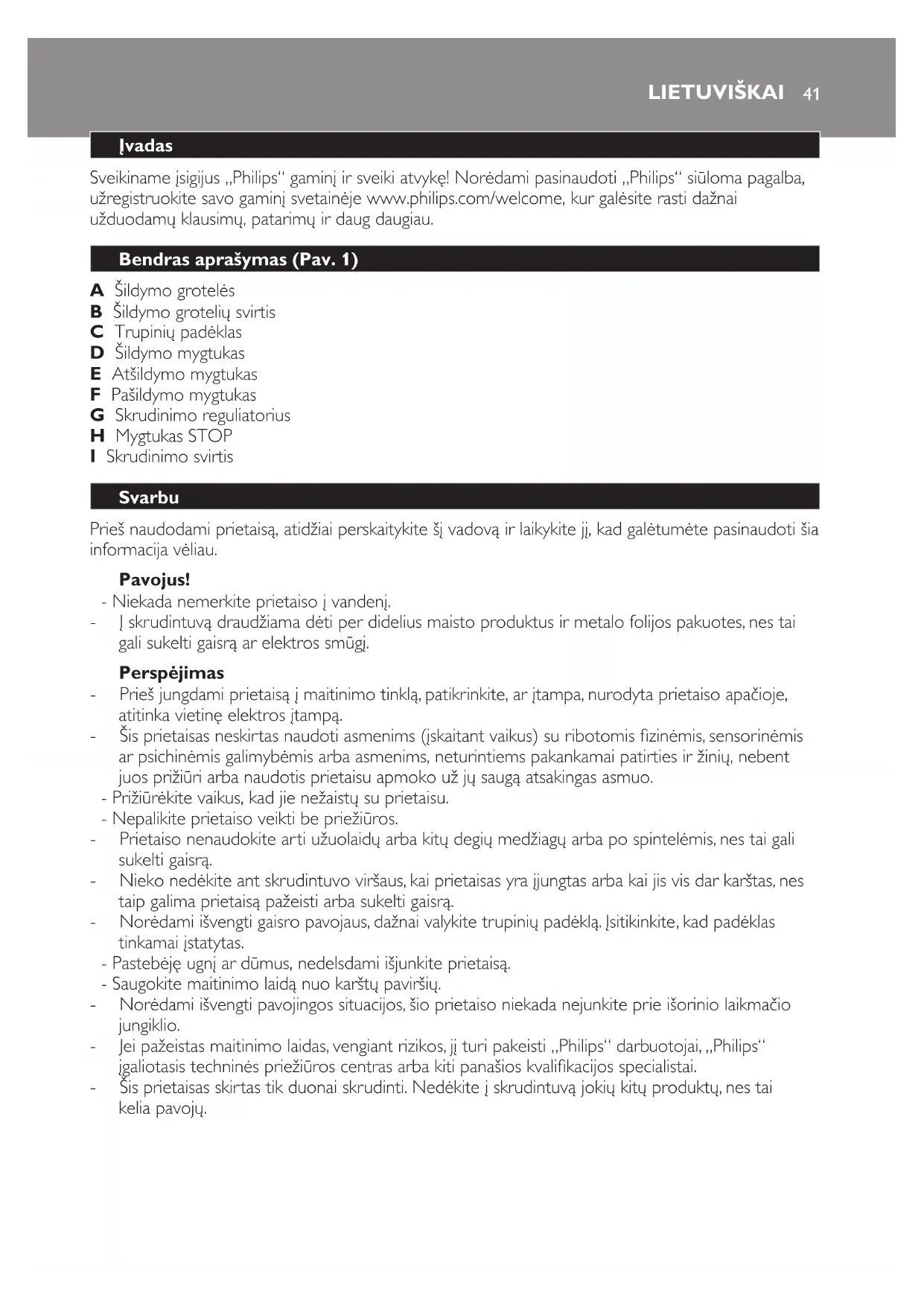- Jei pažeistas maitinimo laidas, vengiant rizikos, jį turi pakeisti „Philips“ darbuotojai, „Philips“