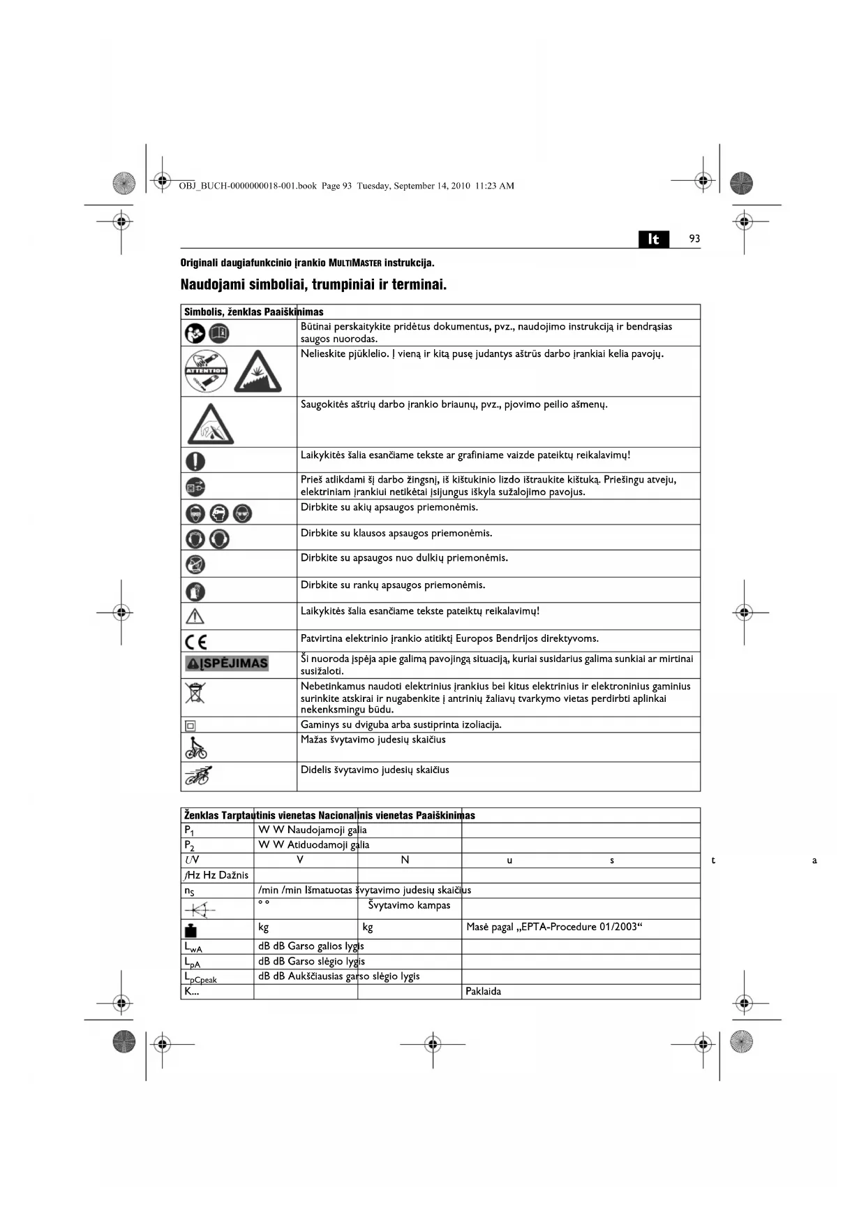 Originali daugiafunkcinio įrankio MULTIMASTER instrukcija. Naudojami simboliai, trumpiniai ir terminai. Simbolis, ženklas Paaiškinimas Būtinai perskaitykite pridėtus dokumentus, pvz., naudojimo instrukciją ir bendrąsias saugos nuorodas. Nelieskite pjūklelio. Į vieną ir kitą pusę judantys aštrūs darbo įrankiai kelia pavojų. Saugokitės aštrių darbo įrankio briaunų, pvz., pjovimo peilio ašmenų. Laikykitės šalia esančiame tekste ar grafiniame vaizde pateiktų reikalavimų! Prieš atlikdami šį darbo žingsnį, iš kištukinio lizdo ištraukite kištuką. Priešingu atveju, elektriniam įrankiui netikėtai įsijungus iškyla sužalojimo pavojus. Dirbkite su akių apsaugos priemonėmis. Dirbkite su klausos apsaugos priemonėmis. Dirbkite su apsaugos nuo dulkių priemonėmis. Dirbkite su rankų apsaugos priemonėmis. Laikykitės šalia esančiame tekste pateiktų reikalavimų! Patvirtina elektrinio įrankio atitiktį Europos Bendrijos direktyvoms. Ši nuoroda įspėja apie galimą pavojingą situaciją, kuriai susidarius galima sunkiai ar mirtinai susižaloti. Nebetinkamus naudoti elektrinius įrankius bei kitus elektrinius ir elektroninius gaminius surinkite atskirai ir nugabenkite į antrinių žaliavų tvarkymo vietas perdirbti aplinkai nekenksmingu būdu. Gaminys su dviguba arba sustiprinta izoliacija. Mažas švytavimo judesių skaičius Didelis švytavimo judesių skaičius Ženklas Tarptautinis vienetas Nacionalinis vienetas Paaiškinimas