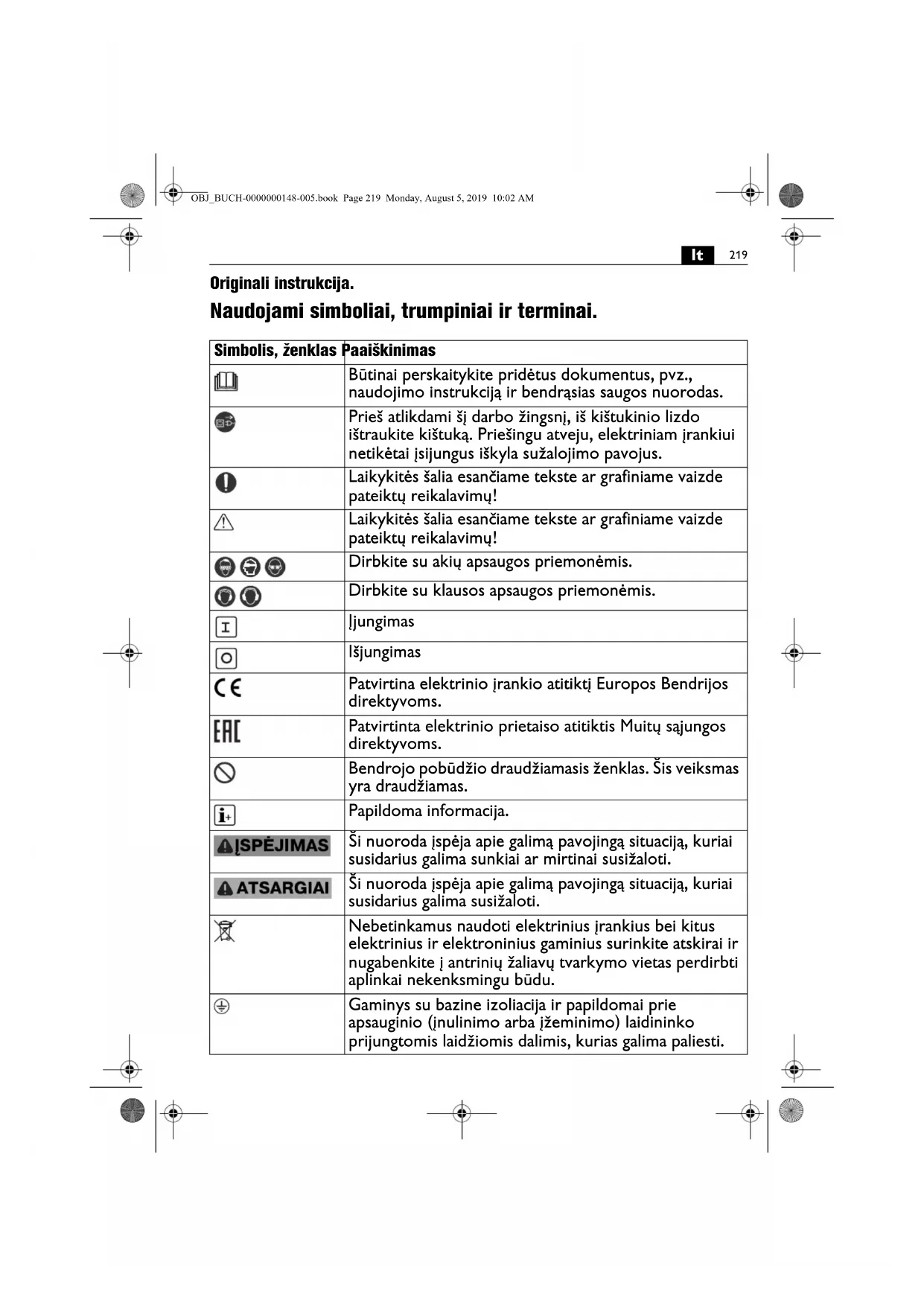 Originali instrukcija. Naudojami simboliai, trumpiniai ir terminai. Simbolis, ženklas Paaiškinimas Būtinai perskaitykite pridėtus dokumentus, pvz., naudojimo instrukciją ir bendrąsias saugos nuorodas. Prieš atlikdami šį darbo žingsnį, iš kištukinio lizdo ištraukite kištuką. Priešingu atveju, elektriniam įrankiui netikėtai įsijungus iškyla sužalojimo pavojus. Laikykitės šalia esančiame tekste ar grafiniame vaizde pateiktų reikalavimų! Laikykitės šalia esančiame tekste ar grafiniame vaizde pateiktų reikalavimų! Dirbkite su akių apsaugos priemonėmis. Dirbkite su klausos apsaugos priemonėmis. Įjungimas Išjungimas Patvirtina elektrinio įrankio atitiktį Europos Bendrijos direktyvoms. Patvirtinta elektrinio prietaiso atitiktis Muitų sąjungos direktyvoms. Bendrojo pobūdžio draudžiamasis ženklas. Šis veiksmas yra draudžiamas. Papildoma informacija. Ši nuoroda įspėja apie galimą pavojingą situaciją, kuriai susidarius galima sunkiai ar mirtinai susižaloti. Ši nuoroda įspėja apie galimą pavojingą situaciją, kuriai susidarius galima susižaloti. Nebetinkamus naudoti elektrinius įrankius bei kitus elektrinius ir elektroninius gaminius surinkite atskirai ir nugabenkite į antrinių žaliavų tvarkymo vietas perdirbti aplinkai nekenksmingu būdu. Gaminys su bazine izoliacija ir papildomai prie apsauginio (įnulinimo arba įžeminimo) laidininko prijungtomis laidžiomis dalimis, kurias galima paliesti. OBJ_BUCH-0000000148-005.book Page 219 Monday, August 5, 2019 10:02 AM220