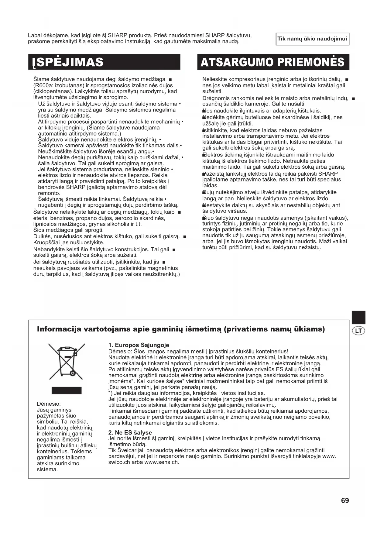 Nelieskite kompresoriaus įrenginio arba jo išorinių dalių, ■ nes jos veikimo metu labai įkaista ir metaliniai kraštai gali sužeisti. Drėgnomis rankomis nelieskite maisto arba metalinių indų, ■ esančių šaldiklio kameroje. Galite nušalti. Nesinaudokite ilgintuvais ar adapterių kištukais. ■ Nedėkite gėrimų buteliuose bei skardinėse į šaldiklį, nes ■ užšalę jie gali įtrūkti. Įsitikinkite, kad elektros laidas nebuvo pažeistas ■ instaliavimo arba transportavimo metu. Jei elektros kištukas ar laidas blogai pritvirtinti, kištuko nekiškite. Tai gali sukelti elektros šoką arba gaisrą. Elektros tiekimą išjunkite ištraukdami maitinimo laido ■ kištuką iš elektros tiekimo lizdo. Netraukite paties maitinimo laido. Tai gali sukelti elektros šoką arba gaisrą. Pažeistą lankstųjį elektros laidą reikia pakeisti SHARP ■ įgaliotame aptarnavimo taške, nes tai turi būti specialus laidas. Dujų nutekėjimo atveju išvėdinkite patalpą, atidarykite ■ langą ar pan. Nelieskite šaldytuvo ar elektros lizdo. Nestatykite daiktų su skysčiais ar nestabilių objektų ant ■ šaldytuvo viršaus. Šiuo šaldytuvu negali naudotis asmenys (įskaitant vaikus), ■ turintys zinių, jutiminių ar protinių negalių arba tie, kurie stokoja patirties bei žinių. Tokie asmenys šaldytuvu gali naudotis tik už jų saugumą atsakingų asmenų priežiūroje, arba jei jis buvo išmokytas įrenginiu naudotis. Maži vaikai turėtų būti prižiūrimi, kad su šaldytuvu nežaistų. Informacija vartotojams apie gaminių išmetimą (privatiems namų ūkiams)