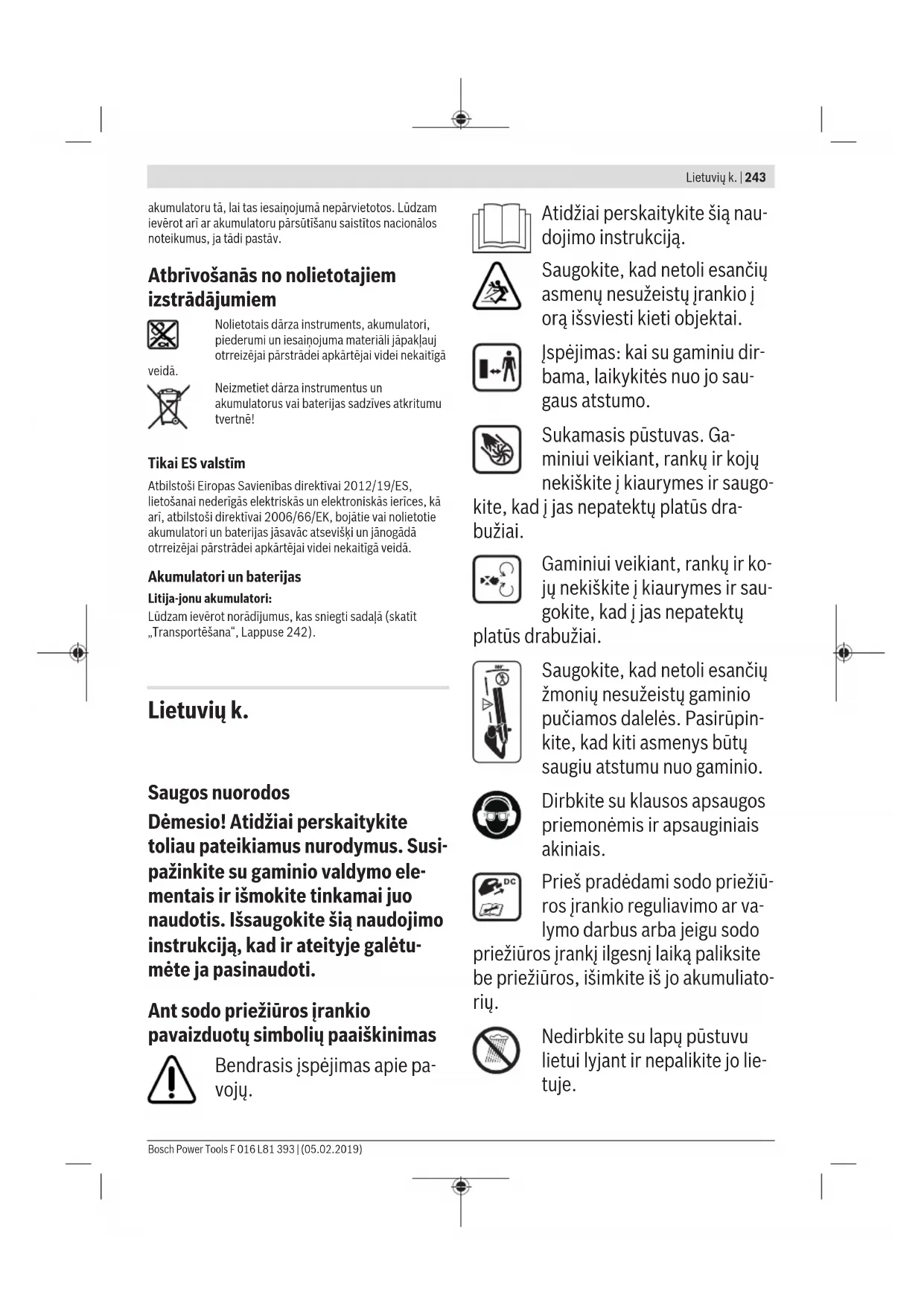 ES atitikties deklaracija Atsakingai pareiškiame, kad išvardyti gaminiai atitinka visus pri- valomus žemiau nurodytų direktyvų ir reglamentų reikalavimus ir šiuos standartus. Akumuliatorinis lapų pū- stuvas Gaminio numeris F 016 L81 393 | (05.02.2019) Bosch Power ToolsIII ALB 36 LI 3 600 HA0 4.. 2006/42/EC 2014/30/EU 2011/65/EU 2000/14/EC EN 60335-1:2012+A11:2014 EN 50636-2-100: 2014 EN 55014-1:2006+A1:2009+A2:2011 EN 55014-2:1997+A1:2001+A2:2008 EN 50581:2012 Bosch Power Tools F 016 L81 393 | (05.02.2019)IV