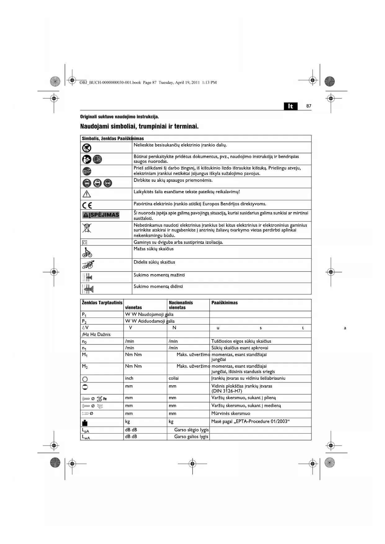 Originali suktuvo naudojimo instrukcija. Naudojami simboliai, trumpiniai ir terminai. Simbolis, ženklas Paaiškinimas Nelieskite besisukančių elektrinio įrankio dalių. Būtinai perskaitykite pridėtus dokumentus, pvz., naudojimo instrukciją ir bendrąsias saugos nuorodas. Prieš atlikdami šį darbo žingsnį, iš kištukinio lizdo ištraukite kištuką. Priešingu atveju, elektriniam įrankiui netikėtai įsijungus iškyla sužalojimo pavojus. Dirbkite su akių apsaugos priemonėmis. Laikykitės šalia esančiame tekste pateiktų reikalavimų! Patvirtina elektrinio įrankio atitiktį Europos Bendrijos direktyvoms. Ši nuoroda įspėja apie galimą pavojingą situaciją, kuriai susidarius galima sunkiai ar mirtinai susižaloti. Nebetinkamus naudoti elektrinius įrankius bei kitus elektrinius ir elektroninius gaminius surinkite atskirai ir nugabenkite į antrinių žaliavų tvarkymo vietas perdirbti aplinkai nekenksmingu būdu. Gaminys su dviguba arba sustiprinta izoliacija. Mažas sūkių skaičius Didelis sūkių skaičius Sukimo momentą mažinti Sukimo momentą didinti Ženklas Tarptautinis vienetas Nacionalinis vienetas Paaiškinimas