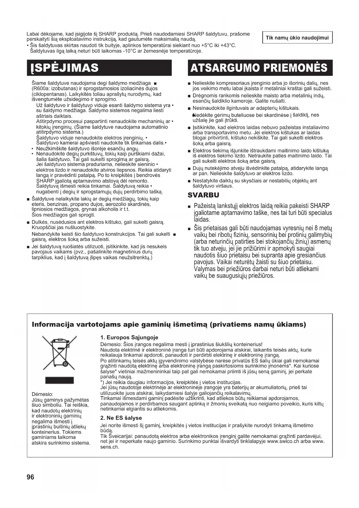 Labai dėkojame, kad įsigijote šį SHARP produktą. Prieš naudodamiesi SHARP šaldytuvu, prašome