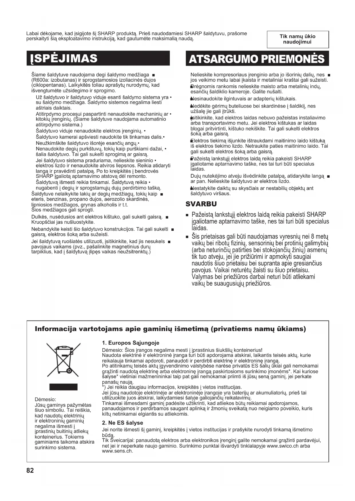Labai dėkojame, kad įsigijote šį SHARP produktą. Prieš naudodamiesi SHARP šaldytuvu, prašome