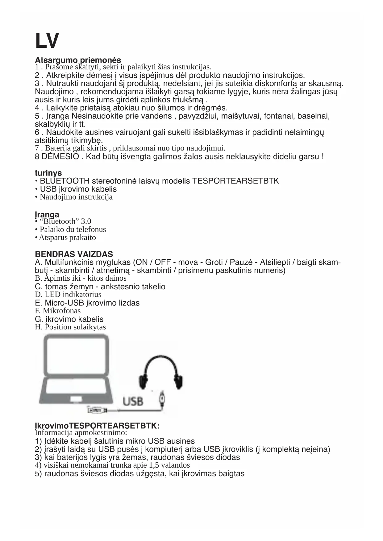 - BLUETOOTH stereofoninė laisvų modelis TESPORTEARSETBTK