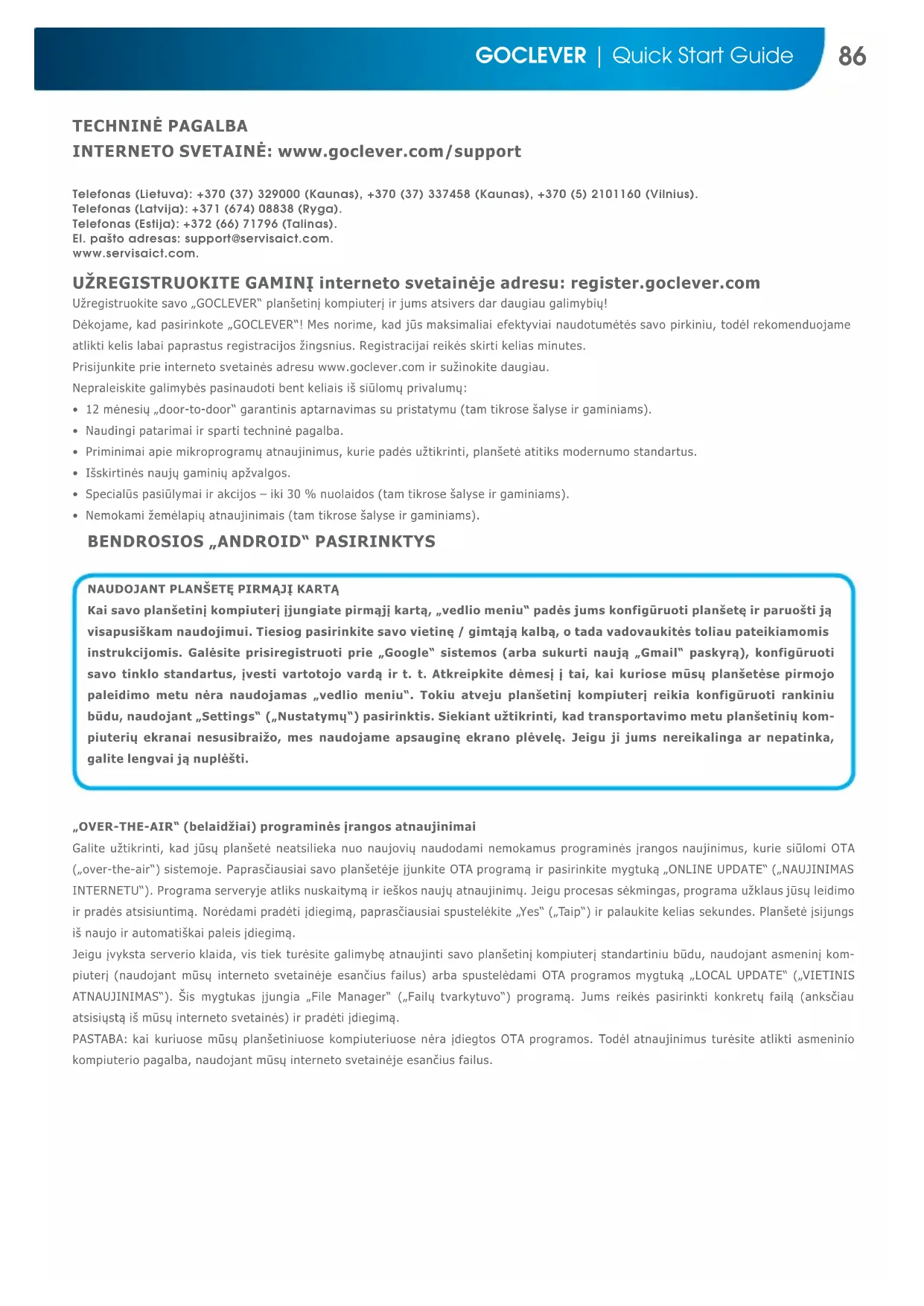 Kai savo planšetinį kompiuterį įjungiate pirmąjį kartą, „vedlio meniu“ padės jums konfigūruoti planšetę ir paruošti ją visapusiškam naudojimui. Tiesiog pasirinkite savo vietinę / gimtąją kalbą, o tada vadovaukitės toliau pateikiamomis instrukcijomis. Galėsite prisiregistruoti prie „Google“ sistemos (arba sukurti naują „Gmail“ paskyrą), konfigūruoti savo tinklo standartus, įvesti vartotojo vardą ir t. t. Atkreipkite dėmesį į tai, kai kuriose mūsų planšetėse pirmojo paleidimo metu nėra naudojamas „vedlio meniu“. Tokiu atveju planšetinį kompiuterį reikia konfigūruoti rankiniu būdu, naudojant „Settings“ („Nustatymų“) pasirinktis. Siekiant užtikrinti, kad transportavimo metu planšetinių kom- piuterių ekranai nesusibraižo, mes naudojame apsauginę ekrano plėvelę. Jeigu ji jums nereikalinga ar nepatinka, galite lengvai ją nuplėšti. UŽREGISTRUOKITE GAMINĮ interneto svetainėje adresu: register.goclever.com Užregistruokite savo „GOCLEVER“ planšetinį kompiuterį ir jums atsivers dar daugiau galimybių! Dėkojame, kad pasirinkote „GOCLEVER“! Mes norime, kad jūs maksimaliai efektyviai naudotumėtės savo pirkiniu, todėl rekomenduojame atlikti kelis labai paprastus registracijos žingsnius. Registracijai reikės skirti kelias minutes. Prisijunkite prie interneto svetainės adresu www.goclever.com ir sužinokite daugiau. Nepraleiskite galimybės pasinaudoti bent keliais iš siūlomų privalumų: