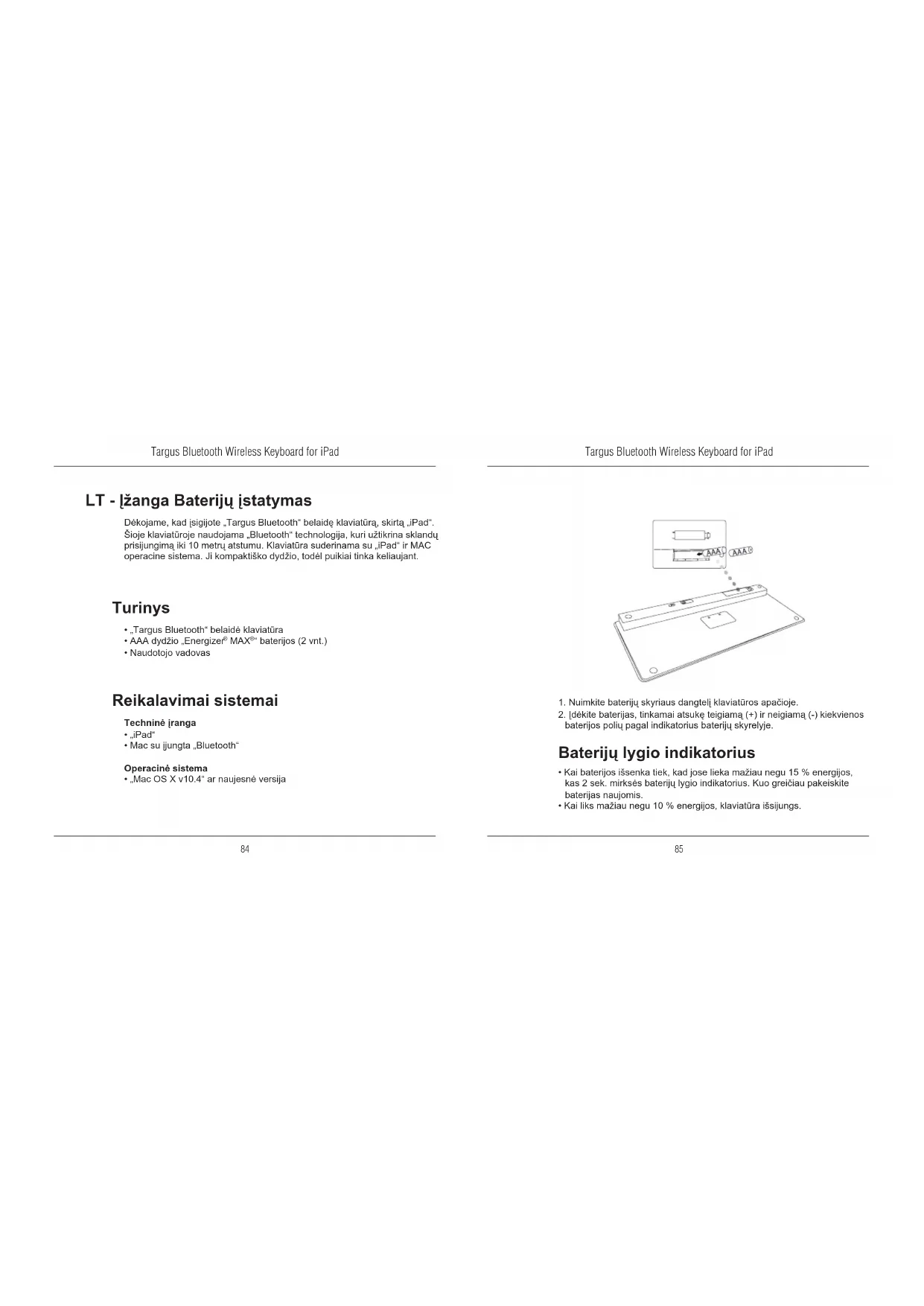 Funkcija Pagrindinis ekranasIeškoti„iPad“ įjungiamas nuotraukos rėmelio režimasEkrane rodoma arba slepiama klaviatūraGreitai pereinama atgal į ankstesnę dainą, lmą ar skaidrių demonstracijąGreitai pereinama pirmyn į kitą dainą, lmą ar skaidrių demonstracijąGrojamos dainos, leidžiami lmai ar skaidrių demonstraci-jos arba leidimas pristabdomas„iPad“ garso išjungimas„iPad“ garso sumažinimas„iPad“ garso padidinimasEkrano užrakinimas „Bluetooth“ prijungimas: „Mac“ 1. Pereikite į „Bluetooth“ piktogramą darbastalyje arba sistemos juostoje ir spustelėkite ant jos, norėdami pradėti sąranką. Pasirinkite „Turn Bluetooth On“ (įjungti „Bluetooth“), norėdami įjungti „Bluetooth“ funkciją savo „Mac“ įrenginyje.2. Pereikite sąrašu žemyn ir pasirinkite „Set up Bluetooth Device...“ (nustatyti „Bluetooth“ prietaisą).3. Bus paleistas „Bluetooth Setup Assistant“ (sąrankos pagalbinė programa). Vykdykite ekrane pateikiamus nurodymus.4. Pasirinkite keyboard ir spustelėkite, norėdami tęsti sąranką. Klaviatūra turi veikti aptikimo režimu („discovery“), kad būtų galima ją prijungti.5. Paspauskite mygtuką „Connect“ (prisijungti) savo „Targus Bluetooth“ belaidės klaviatūros galinėje pusėje, kad įsijungtų aptikimo režimas. Žemo maitinimo lygio indikatorius mirksės mėlynai, kai bus įjungtas aptikimo režimas.6. Jūsų kompiuteris pradės klaviatūros paiešką. Kai klaviatūra bus aptikta, ji bus parodyta sąraše. Išryškinkite „Bluetooth Keyboard“ („Bluetooth“ klaviatūra) ir tęskite.7. „Bluetooth“ klaviatūra bus suporuota. Norėdami tęsti, spauskite „Continue“ (tęsti).8. Sveikiname, jūsų „Bluetooth“ klaviatūra nustatyta ir paruošta naudoti. Galite pasirinkti nustatyti kitą prietaisą arba išeiti iš sąrankos spustelėdami „Quit“ (išeiti).Targus Bluetooth Wireless Keyboard for iPad