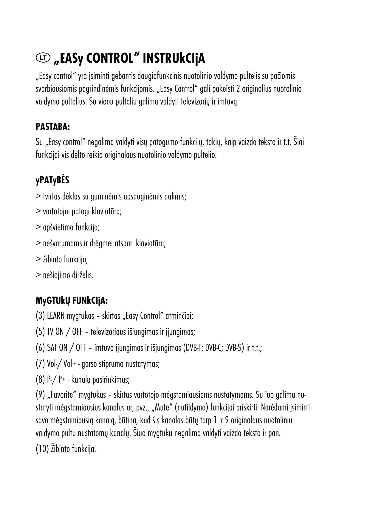 Non buttate le batterie con i rifiuti domestici. Portatel presso il vostro negoziante o smaltitele negli appositi luogi di raccolta. ATTENzIONE A: > Non create un cortocircuito con le batterie. > Se utilizzate pile ricaricabili verificate che il processo di ricarica avvenga sempre sotto la supervisione di un adulto. > Le batterie ricaricabili devono essere rimosse dal telecomando per la ricarica. > Le pile alcaline NON devono essere ricaricate. > Le pile scariche devo essere rimosse dal dispositivo. > Non mescolate pile cariche con pile scariche. > Conservate la confezione ed il manuale per futuri utilizzi. „EASy CONTROL“ INSTRUkCIjA „Easy control“ yra įsiminti gebantis daugiafunkcinis nuotolinio valdymo pultelis su pačiomis svarbiausiomis pagrindinėmis funkcijomis. „Easy Control“ gali pakeisti 2 originalius nuotolinio valdymo pultelius. Su vienu pulteliu galima valdyti televizorių ir imtuvą. PASTABA: Su „Easy control“ negalima valdyti visų patogumo funkcijų, tokių, kaip vaizdo teksto ir t.t. Šiai funkcijai vis dėlto reikia originalaus nuotolinio valdymo pultelio. yPATyBėS > tvirtas dėklas su guminėmis apsauginėmis dalimis; > vartotojui patogi klaviatūra; > apšvietimo funkcija; > nešvarumams ir drėgmei atspari klaviatūra; > žibinto funkcija; > nešiojimo dirželis. MyGTUkų FUNkCIjA: (3) LEARN mygtukas – skirtas „Easy Control“ atminčiai; (5) TV ON / OFF – televizoriaus išjungimas ir įjungimas; (6) SAT ON / OFF – imtuvo įjungimas ir išjungimas (DVB-T; DVB-C; DVB-S) ir t.t.; (7) Vol-/ Vol+ - garso stiprumo nustatymas; (8) P-/ P+ - kanalų pasirinkimas; (9) „Favorite“ mygtukas – skirtas vartotojo mėgstamiausiems nustatymams. Su juo galima nu- statyti mėgstamiausius kanalus ar, pvz., „Mute“ (nutildymo) funkcijai priskirti. Norėdami įsiminti savo mėgstamiausią kanalą, būtina, kad šis kanalas būtų tarp 1 ir 9 originalaus nuotoliniu valdymo pultu nustatomų kanalų. Šiuo mygtuku negalima valdyti vaizdo teksto ir pan. (10) Žibinto funkcija.SAUGOS INSTRUkCIjA > Prieš naudojimą prašome perskaityti naudojimo instrukcijas. > Niekuomet neatidarinėkite prietaiso. > Prietaisas turi būti apsaugotas nuo aukštos temperatūros bei drėgmės ar skysčių. > Norėdami nuvalyti prietaisą, tai darykite tik sausa šluoste. > Laikykite mažiems vaikams nepasiekiamoje vietoje. > Saugos instrukcijų nesilaikymas gali įtakoti prietaiso gedimą bei sukelti pavojų naudotojo sveikatai. NAUDOjIMAS Atidarykite nugarinėje pusėje esantį baterijų dangtelį (1) ir teisingais poliais įdėkite baterijas (žr. baterijų lizde esančius žymėjimus). Uždarykite baterijų dangtelį. „EASy CONTROL“ įSIMINIMO FUNkCIjA: Padėkite „Easy control“ bei originalius nuotolinio valdymo pultelius ant stalo. a. Atidarykite „Easy Control“ dangtelį (2) b. Nuspaudę palaikykite raudoną mygtuką „LEARN“ (įsiminti) (3), kol pradės greitai mirksėti funkcijos šviesos diodas (4). „Easy Control“ – įsiminimo režime. c. Paspauskite „Easy Control“ mygtuką, kurį norite, kad įsimintų. Nuolat dega funkcijos šviesos diodas. d. Padėkite originalų nuotolinio valdymo pultelį maks. 3-5 mm atstumu nuo „Easy control“. Norint, kad įsiminimas praeitų sklandžiai, svarbu, kad „Easy Control“ ir originalaus valdymo pultelio infraraudonųjų spindulių jutikliai būtų nukreipti vienas prieš kitą. „Easy Control“ infraraudonųjų spindulių jutiklis (12) yra šalia žibinto (11). Kad perdavimas vyktų sėkmingai, svarbu nuotolinio valdymo pultelius sudėti taip, kaip matote II pav. e. Nuspaudę palaikykite originalaus nuotolinio valdymo pultelio mygtuką, kurį turi įsiminti „Easy Control“. Laikykite mygtuką nuspaustą, kol pradės greitai mirksėti funkcijos šviesos diodas (4) (duomenų perdavimo metu, šviesos diodas (4) mirksi lėtai). f. Kuomet funkcijos šviesos diodas (4) mirksi greitai, „Easy Control“ gali įsiminti kitą mygtuką.g. Norėdami, kad prietaisas įsimintų kitus mygtukus, pakartokite veiksmus nuo c iki f punkto, kols bus įsiminti visi mygtukai. h. Norėdami baigti ir išsaugoti įsiminimus, paspauskite mygtuką „LEARN“ (3). Dabar funkcijos šviesios diodas (4) nedega, ir tai rodo, kad visi įsiminimai yra baigti.