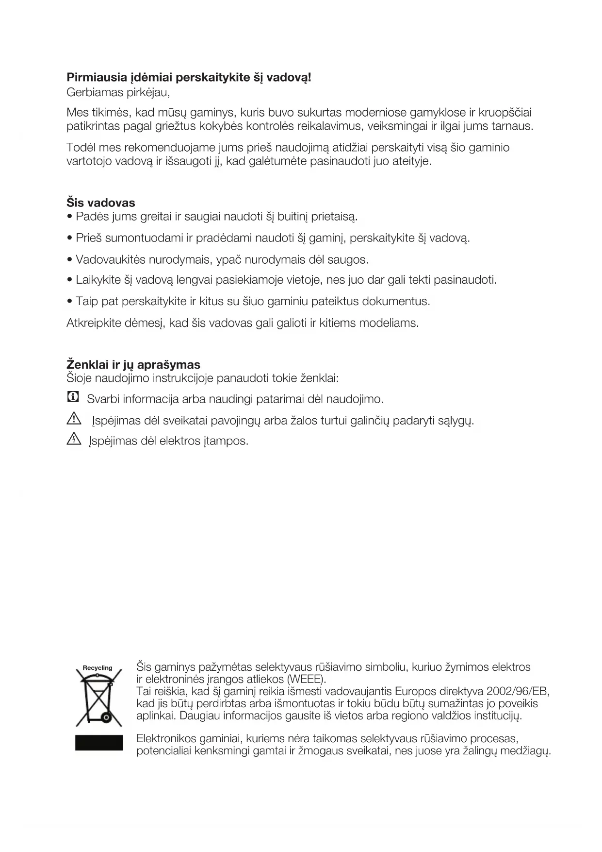 - Taip pat perskaitykite ir kitus su šiuo gaminiu pateiktus dokumentus. Atkreipkite dėmesį, kad šis vadovas gali galioti ir kitiems modeliams. Ženklai ir jų aprašymas Šioje naudojimo instrukcijoje panaudoti tokie ženklai: C Svarbi informacija arba naudingi patarimai dėl naudojimo. A Įspėjimas dėl sveikatai pavojingų arba žalos turtui galinčių padaryti sąlygų. B Įspėjimas dėl elektros įtampos. Šis gaminys pažymėtas selektyvaus rūšiavimo simboliu, kuriuo žymimos elektros ir elektroninės įrangos atliekos (WEEE). Tai reiškia, kad šį gaminį reikia išmesti vadovaujantis Europos direktyva 2002/96/EB, kad jis būtų perdirbtas arba išmontuotas ir tokiu būdu būtų sumažintas jo poveikis aplinkai. Daugiau informacijos gausite iš vietos arba regiono valdžios institucijų. Elektronikos gaminiai, kuriems nėra taikomas selektyvaus rūšiavimo procesas, potencialiai kenksmingi gamtai ir žmogaus sveikatai, nes juose yra žalingų medžiagų. RecyclingLT