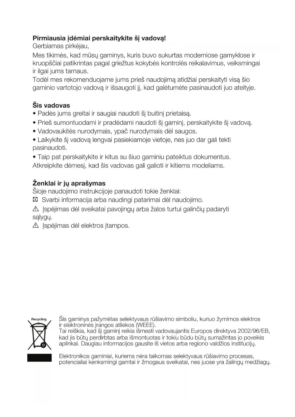 Šis gaminys pažymėtas selektyvaus rūšiavimo simboliu, kuriuo žymimos elektros ir elektroninės įrangos atliekos (WEEE). Tai reiškia, kad šį gaminį reikia išmesti vadovaujantis Europos direktyva 2002/96/EB, kad jis būtų perdirbtas arba išmontuotas ir tokiu būdu būtų sumažintas jo poveikis aplinkai. Daugiau informacijos gausite iš vietos arba regiono valdžios institucijų. Elektronikos gaminiai, kuriems nėra taikomas selektyvaus rūšiavimo procesas, potencialiai kenksmingi gamtai ir žmogaus sveikatai, nes juose yra žalingų medžiagų. Recycling Pirmiausia įdėmiai perskaitykite šį vadovą! Gerbiamas pirkėjau, Mes tikimės, kad mūsų gaminys, kuris buvo sukurtas moderniose gamyklose ir kruopščiai patikrintas pagal griežtus kokybės kontrolės reikalavimus, veiksmingai ir ilgai jums tarnaus. Todėl mes rekomenduojame jums prieš naudojimą atidžiai perskaityti visą šio gaminio vartotojo vadovą ir išsaugoti jį, kad galėtumėte pasinaudoti juo ateityje. Šis vadovas