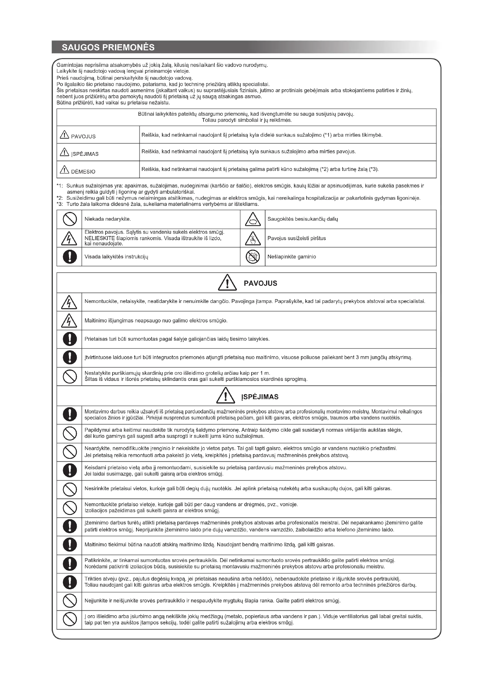 Gamintojas neprisiima atsakomybės už jokią žalą, kilusią nesilaikant šio vadovo nurodymų. Laikykite šį naudotojo vadovą lengvai prieinamoje vietoje. Prieš naudojimą, būtinai perskaitykite šį naudotojo vadovą. Po ilgalaikio šio prietaiso naudojimo, patariama, kad jo techninę priežiūrą atliktų specialistai. Šis prietaisas neskirtas naudoti asmenims (įskaitant vaikus) su suprastėjusiais fi ziniais, jutimo ar protiniais gebėjimais arba stokojantiems patirties ir žinių, nebent juos prižiūrėtų arba pamokytų naudoti šį prietaisą už jų saugą atsakingas asmuo. Būtina prižiūrėti, kad vaikai su prietaisu nežaistu. Būtinai laikykitės pateiktų atsargumo priemonių, kad išvengtumėte su sauga susijusių pavojų. Toliau parodyti simboliai ir jų reikšmės. 0 PAVOJUS Reiškia, kad netinkamai naudojant šį prietaisą kyla didelė sunkaus sužalojimo (*1) arba mirties tikimybė. 0 ĮSPĖJIMAS Reiškia, kad netinkamai naudojant šį prietaisą kyla sunkaus sužalojimo arba mirties pavojus. 0 DĖMESIO Reiškia, kad netinkamai naudojant šį prietaisą galima patirti kūno sužalojimą (*2) arba turtinę žalą (*3). *1: Sunkus sužalojimas yra: apakimas, sužalojimas, nudeginimai (karščio ar šalčio), elektros smūgis, kaulų lūžiai ar apsinuodijimas, kurie sukelia pasekmes ir asmenį reikia guldyti į ligoninę ar gydyti ambulatoriškai. *2: Susižeidimu gali būti nežymus nelaimingas atsitikimas, nudegimas ar elektros smūgis, kai nereikalinga hospitalizacija ar pakartotinis gydymas ligoninėje. *3: Turto žala laikoma didesnė žala, sukeliama materialinėms vertybėms ar ištekliams.