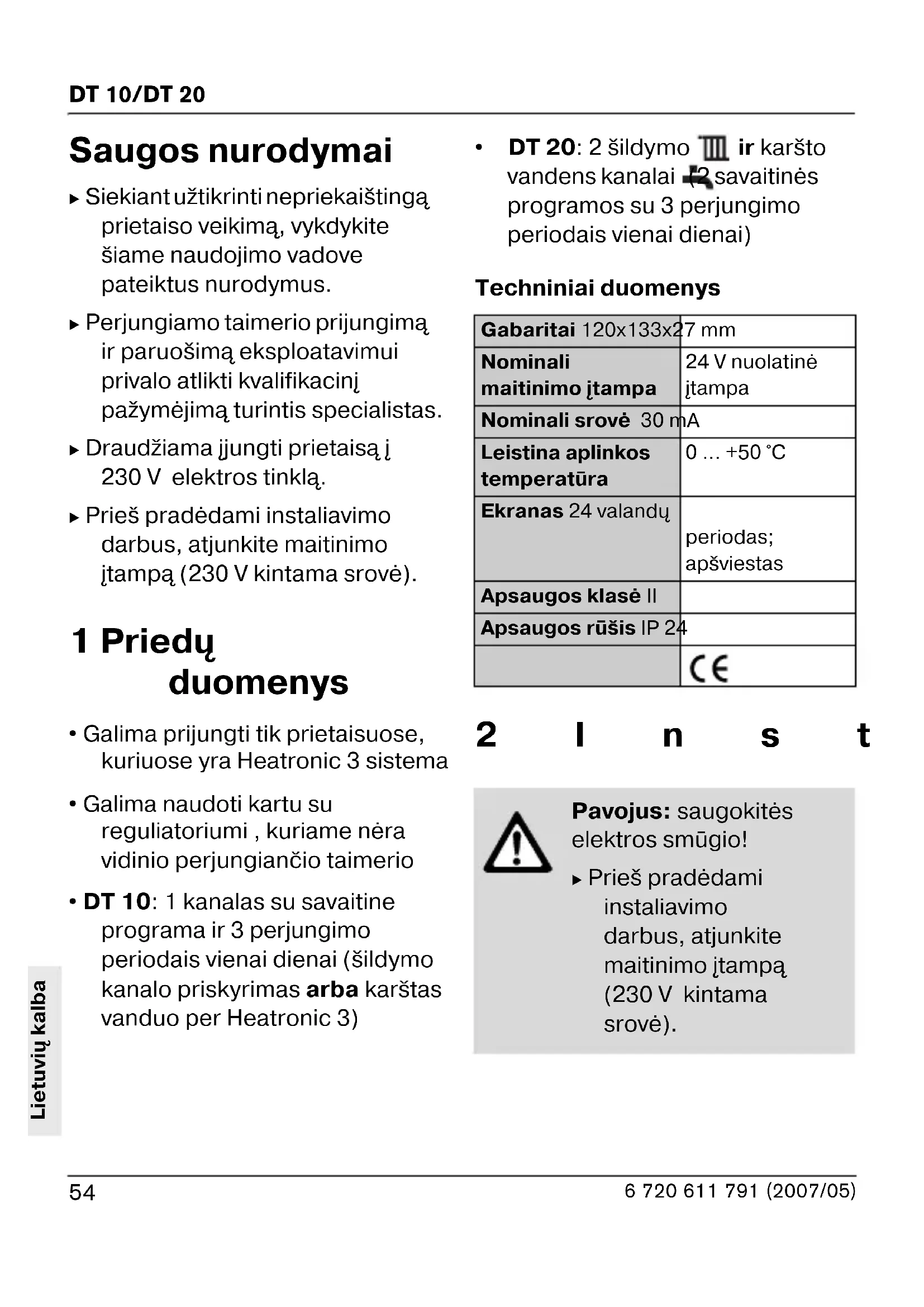 - DT 20: 2 šildymo ir karšto vandens kanalai (2 savaitinės programos su 3 perjungimo periodais vienai dienai) Techniniai duomenys 2Instaliavimas Gabaritai 120x133x27 mm Nominali maitinimo įtampa 24 V nuolatinė įtampa Nominali srovė 30 mA Leistina aplinkos temperatūra 0 ... +50 °C Ekranas 24 valandų periodas; apšviestas Apsaugos klasė II Apsaugos rūšis IP 24 Pavojus: saugokitės elektros smūgio! B Prieš pradėdami instaliavimo darbus, atjunkite maitinimo įtampą (230 V kintama srovė).55 DT 10/DT 20 6 720 611 791 (2007/05) Lietuvių kalba B Išsamus prietaiso aprašymas pateiktas šildymo įrenginio instaliavimo vadove. B Papildomus įtaisus sumontuokite ir prijunkite 2 5 pav., 103 psl, nurodytu būdu. 3 Valdymas
