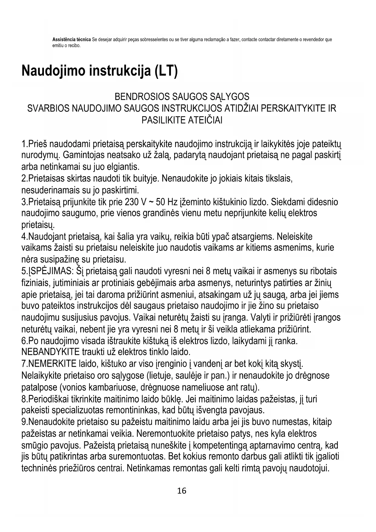1.Prieš naudodami prietaisą perskaitykite naudojimo instrukciją ir laikykitės joje pateiktų nurodymų. Gamintojas neatsako už žalą, padarytą naudojant prietaisą ne pagal paskirtį arba netinkamai su juo elgiantis. 2.Prietaisas skirtas naudoti tik buityje. Nenaudokite jo jokiais kitais tikslais, nesuderinamais su jo paskirtimi. 3.Prietaisą prijunkite tik prie 230 V ~ 50 Hz įžeminto kištukinio lizdo. Siekdami didesnio naudojimo saugumo, prie vienos grandinės vienu metu neprijunkite kelių elektros prietaisų. 4.Naudojant prietaisą, kai šalia yra vaikų, reikia būti ypač atsargiems. Neleiskite vaikams žaisti su prietaisu neleiskite juo naudotis vaikams ar kitiems asmenims, kurie nėra susipažinę su prietaisu. 5.ĮSPĖJIMAS: Šį prietaisą gali naudoti vyresni nei 8 metų vaikai ir asmenys su ribotais fiziniais, jutiminiais ar protiniais gebėjimais arba asmenys, neturintys patirties ar žinių apie prietaisą, jei tai daroma prižiūrint asmeniui, atsakingam už jų saugą, arba jei jiems buvo pateiktos instrukcijos dėl saugaus prietaiso naudojimo ir jie žino su prietaiso naudojimu susijusius pavojus. Vaikai neturėtų žaisti su įranga. Valyti ir prižiūrėti įrangos neturėtų vaikai, nebent jie yra vyresni nei 8 metų ir ši veikla atliekama prižiūrint. 6.Po naudojimo visada ištraukite kištuką iš elektros lizdo, laikydami jį ranka. NEBANDYKITE traukti už elektros tinklo laido. 7.NEMERKITE laido, kištuko ar viso įrenginio į vandenį ar bet kokį kitą skystį. Nelaikykite prietaiso oro sąlygose (lietuje, saulėje ir pan.) ir nenaudokite jo drėgnose patalpose (vonios kambariuose, drėgnuose nameliuose ant ratų). 8.Periodiškai tikrinkite maitinimo laido būklę. Jei maitinimo laidas pažeistas, jį turi pakeisti specializuotas remontininkas, kad būtų išvengta pavojaus. 9.Nenaudokite prietaiso su pažeistu maitinimo laidu arba jei jis buvo numestas, kitaip pažeistas ar netinkamai veikia. Neremontuokite prietaiso patys, nes kyla elektros smūgio pavojus. Pažeistą prietaisą nuneškite į kompetentingą aptarnavimo centrą, kad jis būtų patikrintas arba suremontuotas. Bet kokius remonto darbus gali atlikti tik įgalioti techninės priežiūros centrai. Netinkamas remontas gali kelti rimtą pavojų naudotojui.17 10.Pastatykite prietaisą ant vėsaus stabilaus, lygaus paviršiaus, toliau nuo karštų maisto ruošimo prietaisų, tokių kaip elektrinė viryklė, dujinis degiklis ir pan. 11.Nenaudokite prietaiso šalia degių medžiagų. 12.Maitinimo laidas neturi kaboti per stalo kraštą ir liesti karštų paviršių. 13.Nepalikite prietaiso arba į elektros lizdą įjungto maitinimo šaltinio be priežiūros. 14.Papildomai apsaugai elektros grandinėje patartina įrengti liekamosios srovės įtaisą (RCD), kurio vardinė liekamoji srovė neviršija 30 mA. Šiuo klausimu reikėtų kreiptis į specialistą elektriką.