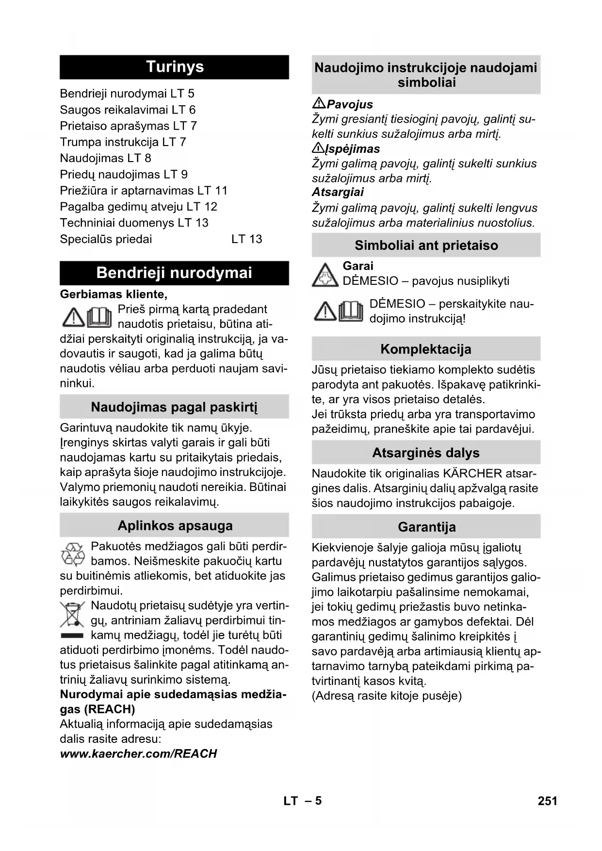 2.884-933 Ļoti labiem gludināšanas rezultātiem un ie- vērojamam laika ietaupījumam (paredzēts tikai 230 V) Tvaika spiediena gludeklis 2.863-209 Nepiedegoša klātne 2.860-142 Piemērots smalku audumu gludināšanai. 250 LVLietuviškai – 5 Gerbiamas kliente, Prieš pirmą kartą pradedant naudotis prietaisu, būtina ati- džiai perskaityti originalią instrukciją, ja va- dovautis ir saugoti, kad ja galima būtų naudotis vėliau arba perduoti naujam savi- ninkui. Garintuvą naudokite tik namų ūkyje. Įrenginys skirtas valyti garais ir gali būti naudojamas kartu su pritaikytais priedais, kaip aprašyta šioje naudojimo instrukcijoje. Valymo priemonių naudoti nereikia. Būtinai laikykitės saugos reikalavimų. Pakuotės medžiagos gali būti perdir- bamos. Neišmeskite pakuočių kartu su buitinėmis atliekomis, bet atiduokite jas perdirbimui. Naudotų prietaisų sudėtyje yra vertin- gų, antriniam žaliavų perdirbimui tin- kamų medžiagų, todėl jie turėtų būti atiduoti perdirbimo įmonėms. Todėl naudo- tus prietaisus šalinkite pagal atitinkamą an- trinių žaliavų surinkimo sistemą. Nurodymai apie sudedamąsias medžia- gas (REACH) Aktualią informaciją apie sudedamąsias dalis rasite adresu: www.kaercher.com/REACH Pavojus Žymi gresiantį tiesioginį pavojų, galintį su- kelti sunkius sužalojimus arba mirtį. 몇 Įspėjimas Žymi galimą pavojų, galintį sukelti sunkius sužalojimus arba mirtį. Atsargiai Žymi galimą pavojų, galintį sukelti lengvus sužalojimus arba materialinius nuostolius. Garai DĖMESIO – pavojus nusiplikyti DĖMESIO – perskaitykite nau- dojimo instrukciją! Jūsų prietaiso tiekiamo komplekto sudėtis parodyta ant pakuotės. Išpakavę patikrinki- te, ar yra visos prietaiso detalės. Jei trūksta priedų arba yra transportavimo pažeidimų, praneškite apie tai pardavėjui. Naudokite tik originalias KÄRCHER atsar- gines dalis. Atsarginių dalių apžvalgą rasite šios naudojimo instrukcijos pabaigoje. Kiekvienoje šalyje galioja mūsų įgaliotų pardavėjų nustatytos garantijos sąlygos. Galimus prietaiso gedimus garantijos galio- jimo laikotarpiu pašalinsime nemokamai, jei tokių gedimų priežastis buvo netinka- mos medžiagos ar gamybos defektai. Dėl garantinių gedimų šalinimo kreipkitės į savo pardavė ją arba artimiausią klientų ap- tarnavimo tarnybą pateikdami pirkimą pa- tvirtinantį kasos kvitą. (Adresą rasite kitoje pusėje) Turinys Bendrieji nurodymai LT 5 Saugos reikalavimai LT 6 Prietaiso aprašymas LT 7 Trumpa instrukcija LT 7 Naudojimas LT 8 Priedų naudojimas LT 9 Priežiūra ir aptarnavimas LT 11 Pagalba gedimų atveju LT 12 Techniniai duomenys LT 13 Specialūs priedai LT 13 Bendrieji nurodymai Naudojimas pagal paskirtį Aplinkos apsauga Naudojimo instrukcijoje naudojami simboliai Simboliai ant prietaiso Komplektacija Atsarginės dalys Garantija 251LT– 6 Pavojus Draudžiama naudoti prietaisą sprogioje aplinkoje. Jei naudojate prietaisą pavojingoje aplinkoje, laikykitės atitinkamų saugos nuorodų. Nenaudokite prietaiso baseinuose, jei- gu juose yra vandens. Draudžiama naudoti prietaisą elektros prietaisų valymui, pavyzdžiui, orkai- tėms, garų surinktuvams, mikrobangų krosnelėms, televizoriams, lempoms, plaukų džiovintuvams, elektros šildytu- vams ir t. t. Prieš naudodami prietaisą ir priedus, patikrinkite, ar jie tvarkingos būklės. Jei jų būklė nėra puiki, prietaiso naudoti ne- galima. Ypač kruopščiai tikrinkite maiti- nimo laidus, techninės priežiūros dangtelį ir garų tiekimo žarną. Pažeistą maitinimo laidą nedelsdami pakeiskite oficialioje klientų aptarnavi- mo tarnyboje ar leiskite pakeisti kvalifi- kuotam elektrikui. Pažeistą garų tiekimo žarną nedelsda- mi pakeiskite. Galima naudoti tik gamin- tojo rekomenduojamą garų tiekimo žarn ą (užsakymo numerį žiūrėkite kei- čiamų detalių sąraše). Niekada nelieskite kištuko ir rozetės šlapiomis rankomis. Nepurkškite garų ant daiktų, kurių sudė- tyje yra sveikatai pavojingų medžiagų (pvz., asbesto). Jokiu būdu arti nekiškite rankos prie garų srauto ir nenukreipkite jo į žmones ar gyvūnus (galite nusiplikyti). Darbo metu negalima atidaryti techni- nės priežiūros dangtelio. 몇 Įspėjimas Prietaisą galima įjungti tik elektros lai- du, kurį pagamino elektros įrangos spe- cialistas pagal standartą IEC 60364. Prietaisą galima jungti tik į kintamosios srovės tinklą. Įtampa turi atitikti prietai- so skydelyje nurodytą įtampą. Drėgnose patalpose, pvz., vonios kam- baryje, junkite prietaisą prie kištukinio lizdo su apsauginiu liekamosios srovės pertraukikliu. Netinkami ilginamieji laidai gali kelti pa- vojų. Naudokite tik vandeniui atsparų il- ginamąjį laidą su ne mažesniu nei 3x1 mm² skersmeniu. Šakutės ir ilginamojo laido jungtis nega- li būti vandenyje. Jei keičiate elektros tinklo ar ilginamojo laidų movas, užtikrinkite, kad laidai bus apsaugoti nuo purškiamo vandens ir at- sparūs mechaniniam poveikiui. Vartotojas prietaisą turi naudoti pagal nurodymus. Jis turi paisyti aplinkos są- lygų, o dirbdamas – netoliese esančių žmonių laikytis Vaikai nuo 8 metų bei fizinę, sensorinę ir dvasinę negalią turintys bei pakanka- mai patirties ir žinių neturintys asmenys gali naudoti įrenginį tik prižiūrimi arba apmokyti, kaip saugiai jį naudoti ir su- vokdami su tuo susijusius pavojus. Šiuo įrenginiu draudžiama žaisti vaikams. Vaikai be priežiūros negali valyti įrengi- nio ir atlikti jo techninės priežiūros. Niekada nepalikite veikiančio prietaiso be priežiūros. Būkite atsargūs valydami plytelėmis klo- tas sienas su elektros šakutės lizdais. Atsargiai Patikrinkite, ar elektros arba ilgintuvo lai- das nepervažiuotas, nesuspaustas, neiš- tampytas ar kitaip nepažeistas. Saugokite elektros laidus nuo karščio, naftos ir netempkite jų virš aštrių briaunų. Jokiu būdu į vandens rezervuarą nepil- kite tirpiklių, skysč