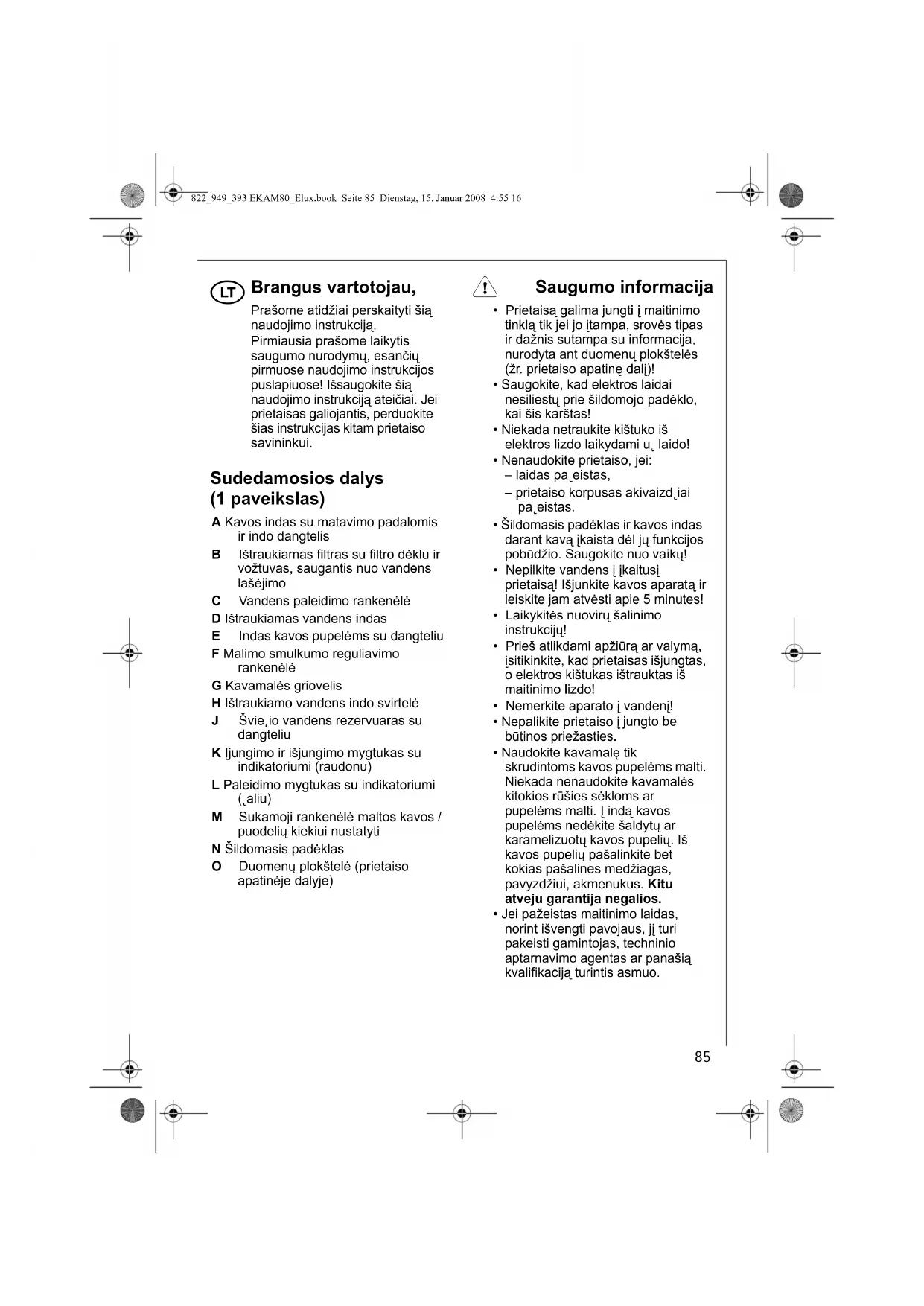 - Jei pažeistas maitinimo laidas, norint išvengti pavojaus, jį turi pakeisti gamintojas, techninio aptarnavimo agentas ar panašią kvalifikaciją turintis asmuo. 822_949_393 EKAM80_Elux.book Seite 85 Dienstag, 15. Januar 2008 4:55 16