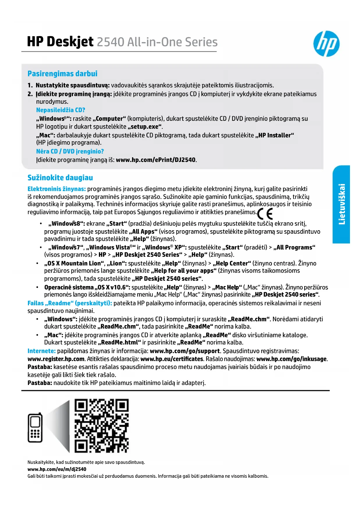 “: raskite „Computer“ (kompiuteris), dukart spustelėkite CD / DVD įrenginio piktogramą su HP logotipu ir dukart spustelėkite „setup.exe“. „Mac“: darbalaukyje dukart spustelėkite CD piktogramą, tada dukart spustelėkite „HP Installer“ (HP įdiegimo programa). Nėra CD / DVD įrenginio? Įdiekite programinę įrangą iš: www.hp.com/ePrint/DJ2540. Sužinokite daugiau Elektroninis žinynas: programinės įrangos diegimo metu įdiekite elektroninį žinyną, kurį galite pasirinkti iš rekomenduojamos programinės įrangos sąrašo. Sužinokite apie gaminio funkcijas, spausdinimą, trikčių diagnostiką ir palaikymą. Techninės informacijos skyriuje galite rasti pranešimus, aplinkosaugos ir teisinio reguliavimo informaciją, taip pat Europos Sąjungos reguliavimo ir atitikties pranešimus.