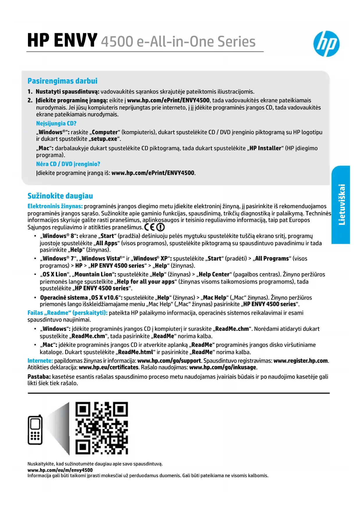 nurodymais. Jei jūsų kompiuteris neprijungtas prie interneto, į jį įdėkite programinės įrangos CD, tada vadovaukitės ekrane pateikiamais nurodymais. Neįsijungia CD? „Windows®“: raskite „Computer“ (kompiuteris), dukart spustelėkite CD / DVD įrenginio piktogramą su HP logotipu ir dukart spustelkite „setup.exe“. „Mac“: darbalaukyje dukart spustelėkite CD piktogramą, tada dukart spustelėkite „HP Installer“ (HP įdiegimo programa). Nėra CD / DVD įrenginio? Įdiekite programinę įrangą iš: www.hp.com/ePrint/ENVY4500. Sužinokite daugiau Elektroninis žinynas: programinės įrangos diegimo metu įdiekite elektroninį žinyną, jį pasirinkite iš rekomenduojamos programinės įrangos sąrašo. Sužinokite apie gaminio funkcijas, spausdinimą, trikčių diagnostiką ir palaikymą. Techninės informacijos skyriuje galite rasti pranešimus, aplinkosaugos ir teisinio reguliavimo informaciją, taip pat Europos Sąjungos reguliavimo ir atitikties pranešimus.