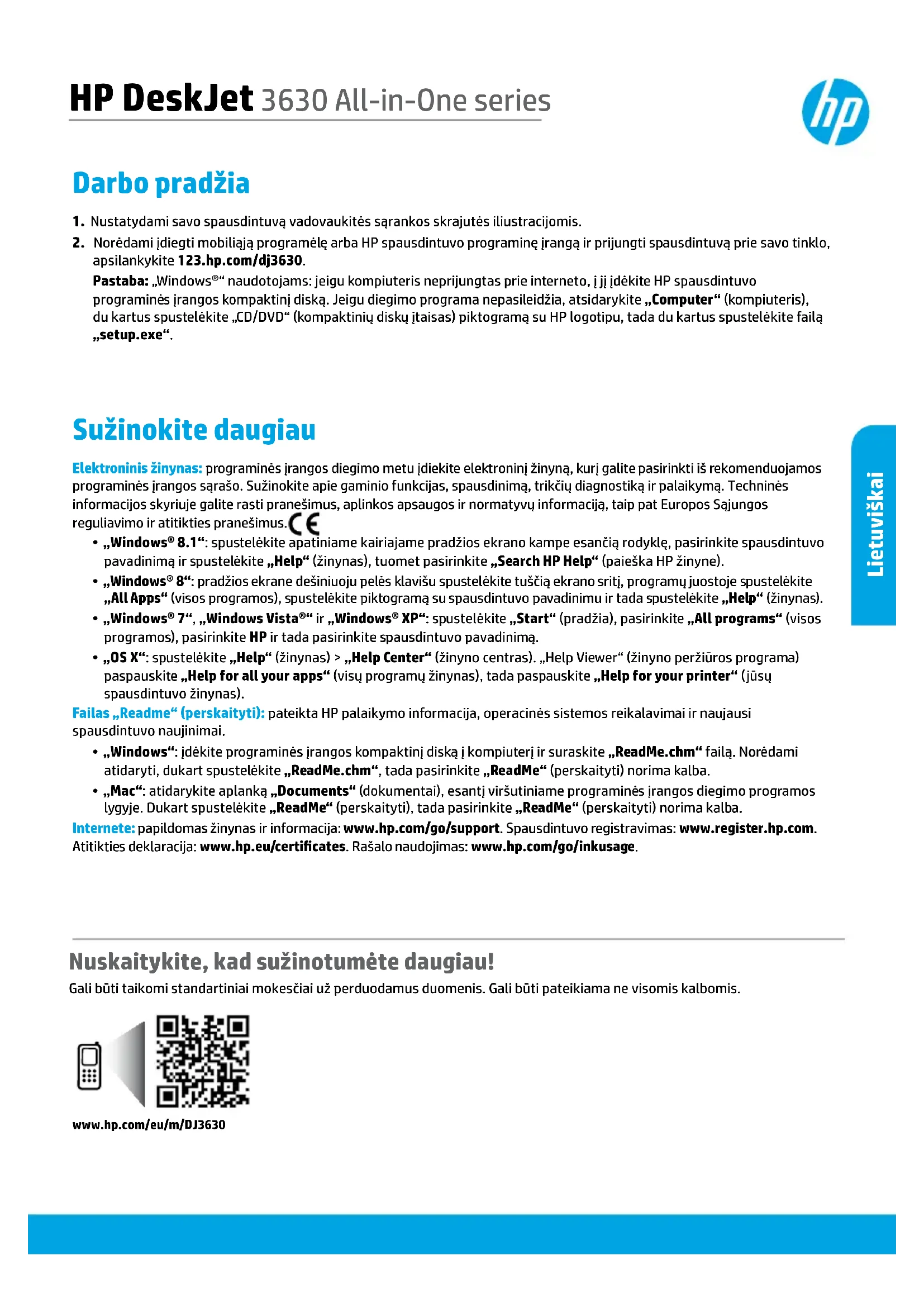 - „Mac“: atidarykite aplanką „Documents“ (dokumentai), esantį viršutiniame programinės įrangos diegimo programos lygyje. Dukart spustelėkite „ReadMe“ (perskaityti), tada pasirinkite „ReadMe“ (perskaityti) norima kalba. Internete: papildomas žinynas ir informacija: www.hp.com/go/support. Spausdintuvo registravimas: www.register.hp.com. Atitikties deklaracija: www.hp.eu/certicates. Rašalo naudojimas: www.hp.com/go/inkusage. Darbo pradžia