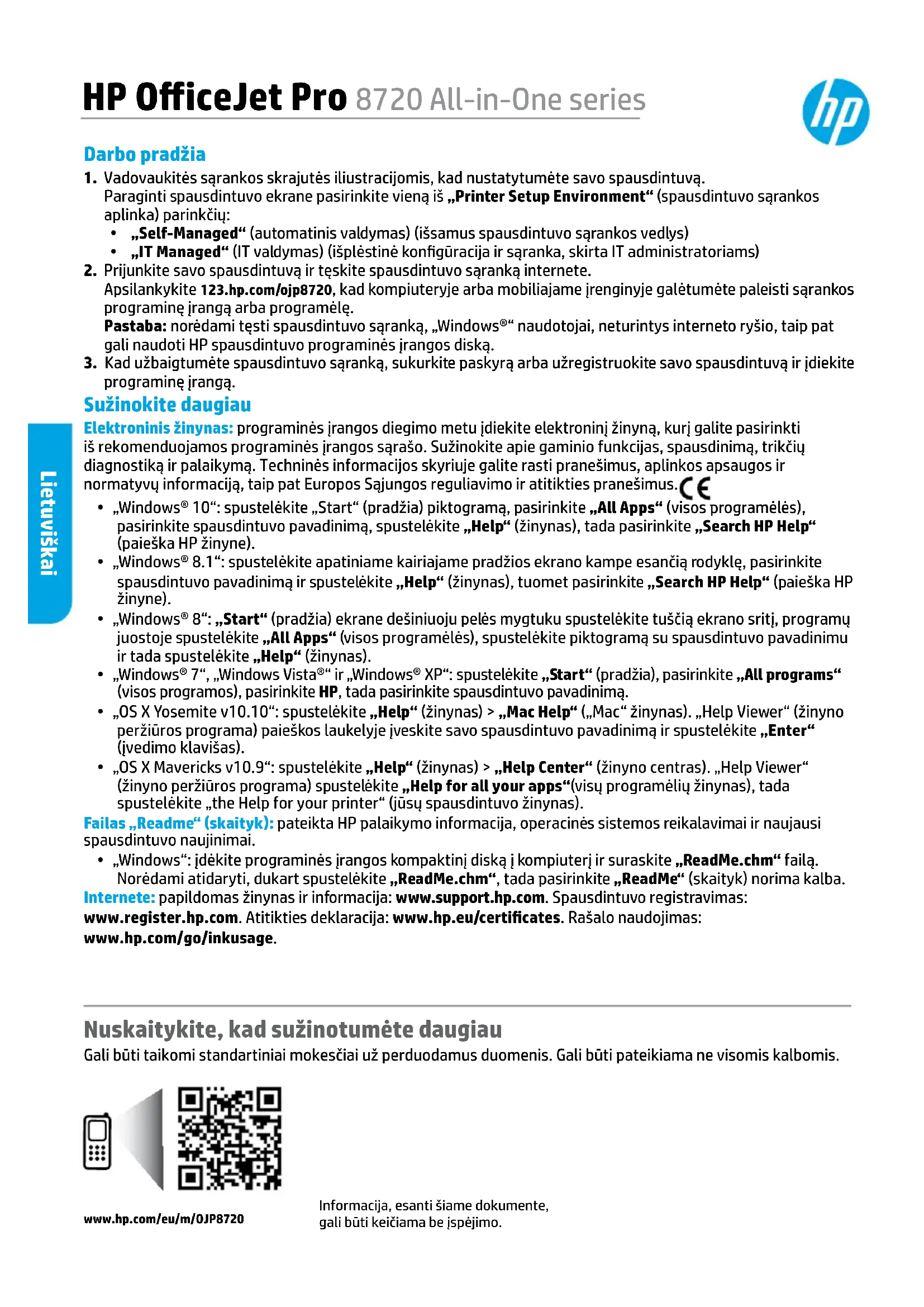 - „Windows“: įdėkite programinės įrangos kompaktinį diską į kompiuterį ir suraskite „ReadMe.chm“ failą. Norėdami atidaryti, dukart spustelėkite „ReadMe.chm“, tada pasirinkite „ReadMe“ (skaityk) norima kalba. Internete: papildomas žinynas ir informacija: www.support.hp.com. Spausdintuvo registravimas: www.register.hp.com. Atitikties deklaracija: www.hp.eu/certicates. Rašalo naudojimas: www.hp.com/go/inkusage.Informacija, esanti šiame dokumente, gali būti keičiama be įspėjimo. Nuskaitykite, kad sužinotumėte daugiau Gali būti taikomi standartiniai mokesčiai už perduodamus duomenis. Gali būti pateikiama ne visomis kalbomis.www.hp.com/eu/m/OJP8720 Lietuviškai81 Belaidis Vadovaudamiesi instrukcijomis, pateikiamomis spausdintuvo valdymo skydelyje, ir įdiegę HP spausdintuvo programinę įrangą, turėtumėte sėkmingai prijungti spausdintuvą prie belaidžio tinklo. Pastaba: jeigu norite pakeisti spausdintuvo naudojamą ryšio tipą (pavyzdžiui, ir iš USB į belaidį arba atvirkščiai), turite naudoti įrankius, pateiktus kartu su HP spausdintuvo programine įranga. Patarimas: su „Wi-Fi Direct “ (tiesioginis „Wi-Fi“ ryšys) galite spausdinti tiesiai iš kompiuterio, išmaniojo telefono, planšetinio kompiuterio arba belaidį ryšį palaikančio įrenginio neprisijungdami prie esamo belaidžio ryšio tinklo. Daugiau informacijos pateikta elektroniniame žinyne „Ryšio tipo keitimas“ ir „Wi-Fi Direct" (tiesioginis „Wi-Fi“ ryšys) naudojimas“ (žr. 80 psl. „Sužinokite daugiau“). Belaidžio tinklo problemų šalinimas