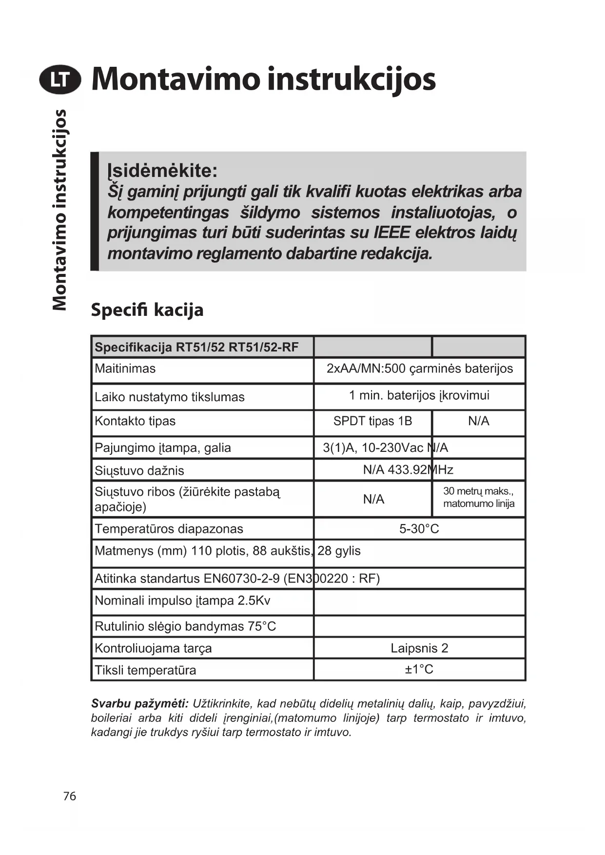 RX imtuvo laidai (tik RF modeliams) Dėmesio! Jei naudojate su maitinimo šaltiniais veikiančias sistemas, prijunkite 2 gnybtą prie maitinimo šaltinio. Montavimo instrukcijos LT80 Paleidimas (tiktai RF versijoms) Jeigu termostatas ir imtuvas tiekiami kartu vienoje pakuotėje, jie parenkami gamykloje, todėl derinimas nereikalingas (tik RX1 modeliams). Norėdami suderinti RX imtuvą su termostato signalo dažniu, atlikite toliau nurodytus 1-5 veiksmus. 1 RT51/52-RF Iš naujo paleiskite prietaisą: 2 minutėms ištraukite baterijas, o paskui jas pakeiskite. 2 Paspauskite ir + klavišus ir palaikykite juos nuspaudę 3 sekundes. (RT51/52 dabar 5 minutes nepertraukiamai siunčia unikalius signalus). 3 RX1 Paspauskite kartu PROG ir CH1 klavišus ir palaikykite 3 sekundes juos nuspaudę, kol vieną kartą blykstelės žalia šviesa. 4 RX2 (jei taikoma) Stat 1 – atlikite 1-3 veiksmus; Stat 2 – palaukite 5 minutes, atlikite 1-2 veiksmus ir tada paspauskite klavišus PROG ir CH2, esančius RX2. RX3 (jei taikoma) Stat 1 – atlikite 1-3 veiksmus; Stat 2 – palaukite 5 minutes, atlikite 1-2 veiksmus ir tada paspauskite klavišus PROG ir CH2, esančius RX3; Stat 3 – palaukite 5 minutes, atlikite 1-2 veiksmus ir tada paspauskite klavišus PROG ir CH3, esančius RX3. 5 RT51/52-RF Norėdami pasirinkti temperatūrą, paspauskite ar – prietaisas persijungs į darbo režimą. Montavimo instrukcijos LT81 Informacija Vartotojui Jūsų kambario termostatas RT51 RT51 yra nesudėtingas kambario termostatas, leidžiantis užprogramuoti dienos ir nakties temperatūrą bei perjungti iš vieno nustatymo į kitą tiesiog paspaudžiant 2 klavišus. RT52 RT52 būdingos tos pačios funkcijos kaip ir RT51, tačiau jame papildomai įmontuotas laikmatis, jūsų pasirinktu laiku perjungiantis termostatą į dienos temperatūrą. Bevieliai RF modeliaiAbu modelius galima įsigyti kaip bevieles versijas (RT51-RF ir RT52-RF), kurioms būdingos visiškai tos pačios funkcijos kaip ir modeliams su laidais.Visi termostatai palaiko ryšį su RX imtuvu, kuris gali būti sumontuotas iki 30 m atstumu. Jūsų rodmenų nuskaitymas