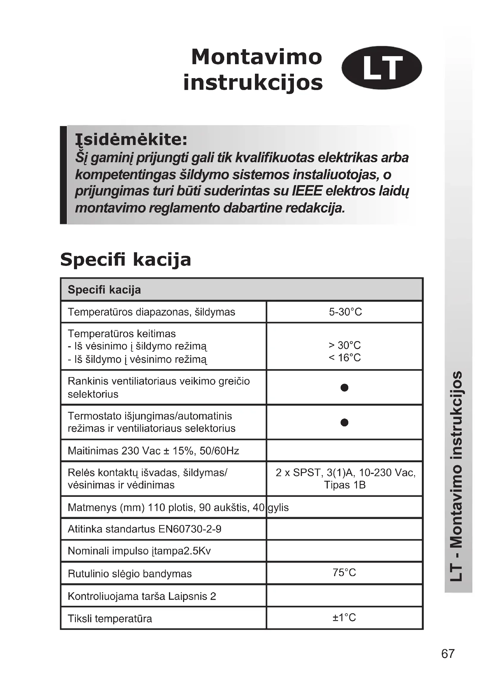 LT - Montavimo instrukcijos Specifi kacijaTemperatūros diapazonas, šildymas 5-30°CTemperatūros keitimas - Iš vėsinimo į šildymo režimą- Iš šildymo į vėsinimo režimą> 30°C< 16°CRankinis ventiliatoriaus veikimo greičio selektorius Termostato išjungimas/automatinis režimas ir ventiliatoriaus selektorius Maitinimas 230 Vac ± 15%, 50/60HzRelės kontaktų išvadas, šildymas/ vėsinimas ir vėdinimas2 x SPST, 3(1)A, 10-230 Vac, Tipas 1BMatmenys (mm) 110 plotis, 90 aukðtis, 40 gylisAtitinka standartus EN60730-2-9Nominali impulso átampa 2.5KvRutulinio slëgio bandymas 75°C Kontroliuojama tarša Laipsnis 2Tiksli temperatūra ±1°C Specifi kacija68 LT - Montavimo instrukcijos Gaminio aprašymas Termostatas yra skirtas naudoti sistemose su ventiliatoriniais, konvektoriais, prijungtais prie 2 vamzdžių pagrindinės keitimo sistemos. Termostatas reguliuoja vožtuvo su pavara veikimą: vožtuvas šildymo ir vėsinimo periodais atsidaro, kai yra būtina kiekvienu atveju aktyvuoti atitinkamą temperatūrą. Šildymo režimas į vėsinimo yra perjungiamas automatiškai, išmatavus įtekančios srovės vamzdyje temperatūrą. Jei srovės temperatūra yra didesnė nei 30°C, įrenginys veikia kaip šildymo termostatas, o jei srovės temperatūra yra mažesnė nei 16°C – kaip vėsinimo termostatas. Būtina įsidėmėti. Labai svarbu, kad grandinė, kurioje yra vamzdžio daviklis, nebūtų uždaryta ir kad visąlaik per daviklį cirkuliuotų vanduo. Todėl gali tekti pritvirtinti papildomą vožtuvą tarp sistemos įtekėjimo ir grįžimo kiekvienos grandinės gale. Montavimo instrukcijos Iš pradžių nuimkite sienos plokštelę nuo prietaiso galo Nuo viršutinio kairiojo sienos plokštelės kampo iki dešiniojo krašto turi būti mažiausiai 50 mm viršuje ir 100 mm apačioje tarpas, kad būtų galima sumontuoti jungiamą kištuku modulį. !69 Pritvirtinkite prietaisą apie 1,5 m aukštyje nuo grindų, atokiau nuo skersvėjo ar šilumos šaltinių, pvz., radiatorių, atviros ugnies ar tiesioginių saulės spindulių. Vamzdžio daviklio tvirtinimas Pritvirtinkite vamzdžio daviklį prie srovės įtekėjimo vamzdžio. Šiam tikslui naudokite suspaudžiamąją juostą. Būtina įsidėmėti. Labai svarbu, kad grandinė, kurioje yra vamzdžio daviklis, nebūtų uždaryta ir kad visąlaik per daviklį cirkuliuotų vanduo. Todėl gali tekti pritvirtinti papildomą vožtuvą tarp sistemos įtekėjimo ir grįžimo kiekvienos grandinės gale.