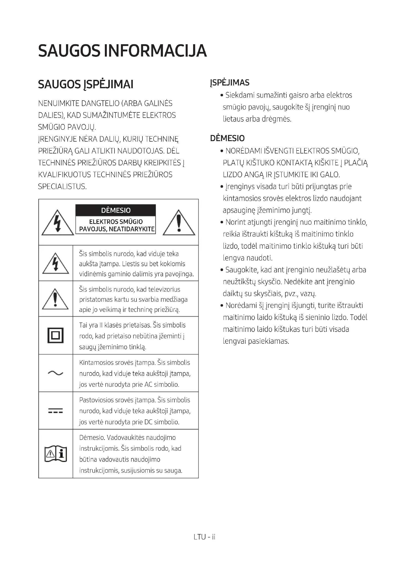 SPECIALISTUS. DĖMESIO ELEKTROS SMŪGIO PAVOJUS, NEATIDARYKITEŠis simbolis nurodo, kad viduje teka aukšta įtampa. Liestis su bet kokiomis vidinėmis gaminio dalimis yra pavojinga.Šis simbolis nurodo, kad televizorius pristatomas kartu su svarbia medžiaga apie jo veikimą ir techninę priežiūrą.Tai yra II klasės prietaisas. Šis simbolis rodo, kad prietaiso nebūtina įžeminti į saugų įžeminimo tinklą.Kintamosios srovės įtampa. Šis simbolis nurodo, kad viduje teka aukštoji įtampa, jos vertė nurodyta prie AC simbolio.Pastoviosios srovės įtampa. Šis simbolis nurodo, kad viduje teka aukštoji įtampa, jos vertė nurodyta prie DC simbolio.Dėmesio. Vadovaukitės naudojimo instrukcijomis. Šis simbolis rodo, kad būtina vadovautis naudojimo instrukcijomis, susijusiomis su sauga. ĮSPĖJIMAS