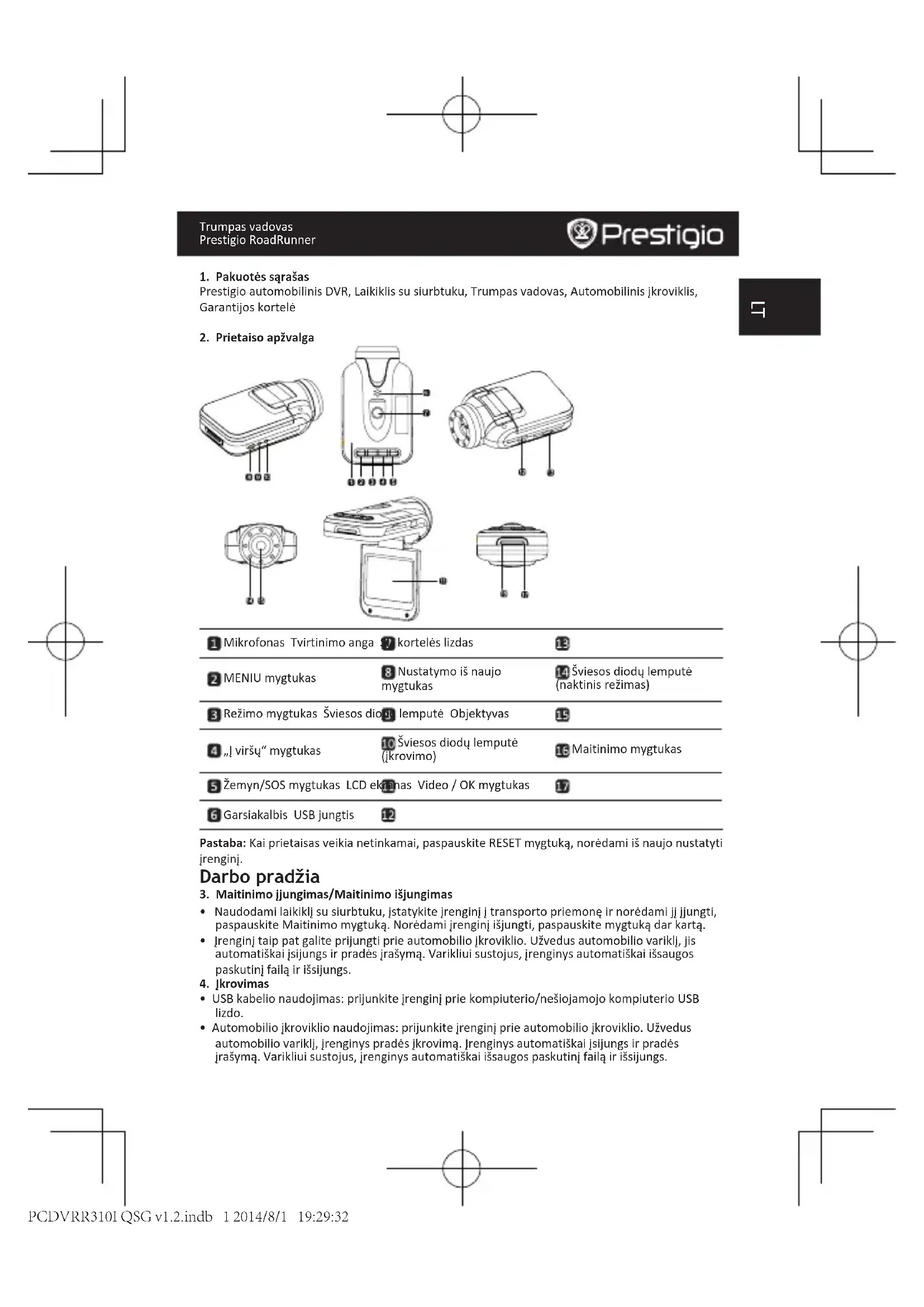 - Pakartotinas panaudojimas: kai Micro SD kortelėje nebeliks laisvos vietos, įrenginys PCDVRR310I QSG v1.2.indb 2 2014/8/1 19:29:32Trumpas vadovas Prestigio RoadRunner