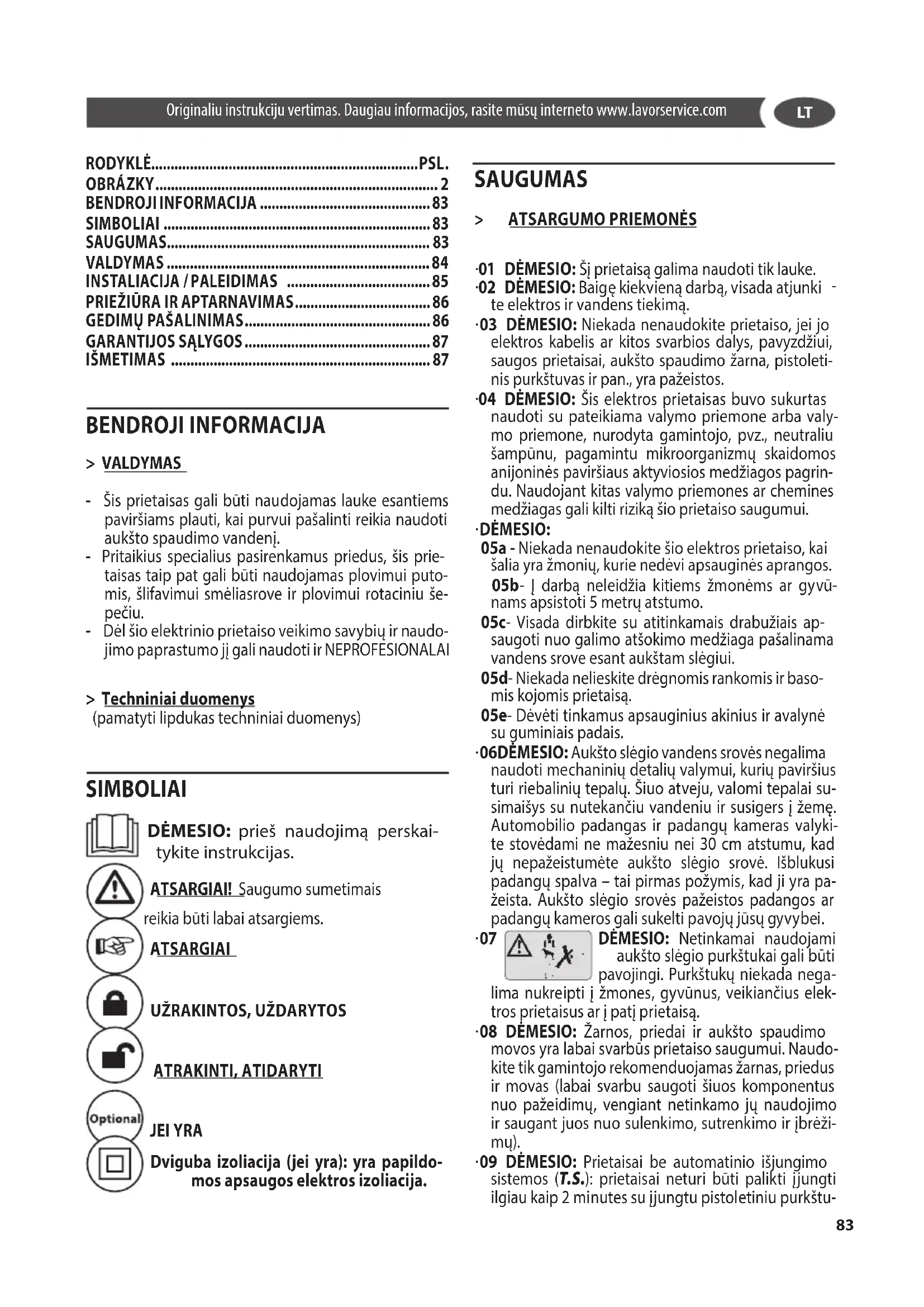 BENDROJI INFORMACIJA > VALDYMAS - Šis prietaisas gali būti naudojamas lauke esantiems paviršiams plauti, kai purvui pašalinti reikia naudoti aukšto spaudimo vandenį. - Pritaikius specialius pasirenkamus priedus, šis prie- taisas taip pat gali būti naudojamas plovimui puto- mis, šlifavimui smėliasrove ir plovimui rotaciniu še- pečiu. - Dėl šio elektrinio prietaiso veikimo savybių ir naudo- jimo paprastumo jį gali naudoti ir NEPROFESIONALAI > Techniniai duomenys (pamatyti lipdukas techniniai duomenys) SIMBOLIAI DĖMESIO: prieš naudojimą perskai- tykite instrukcijas. ATSARGIAI! Saugumo sumetimais reikia būti labai atsargiems. ATSARGIAI