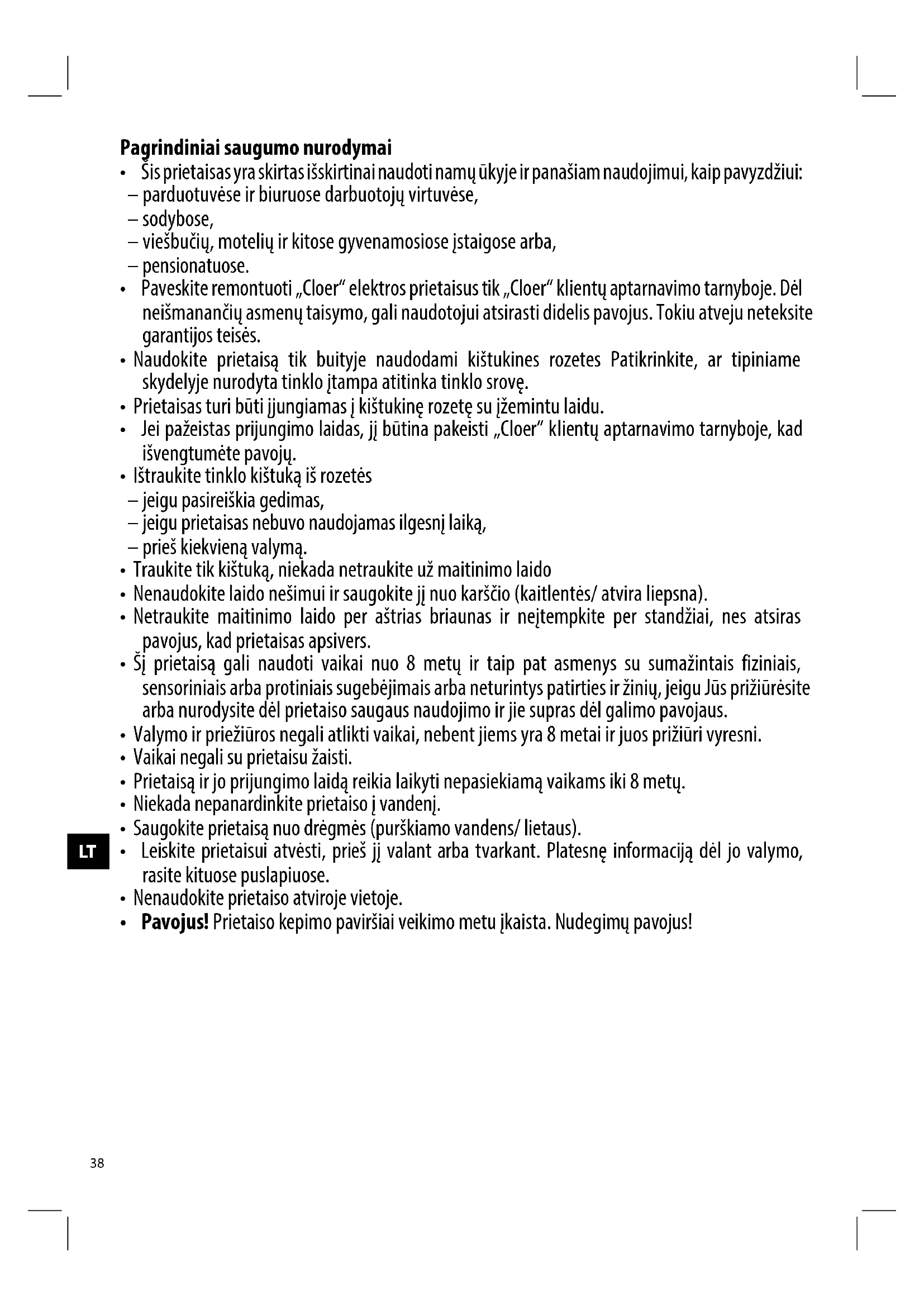 - Valymo ir priežiūros negali atlikti vaikai, nebent jiems yra 8 metai ir juos prižiūri vyresni.