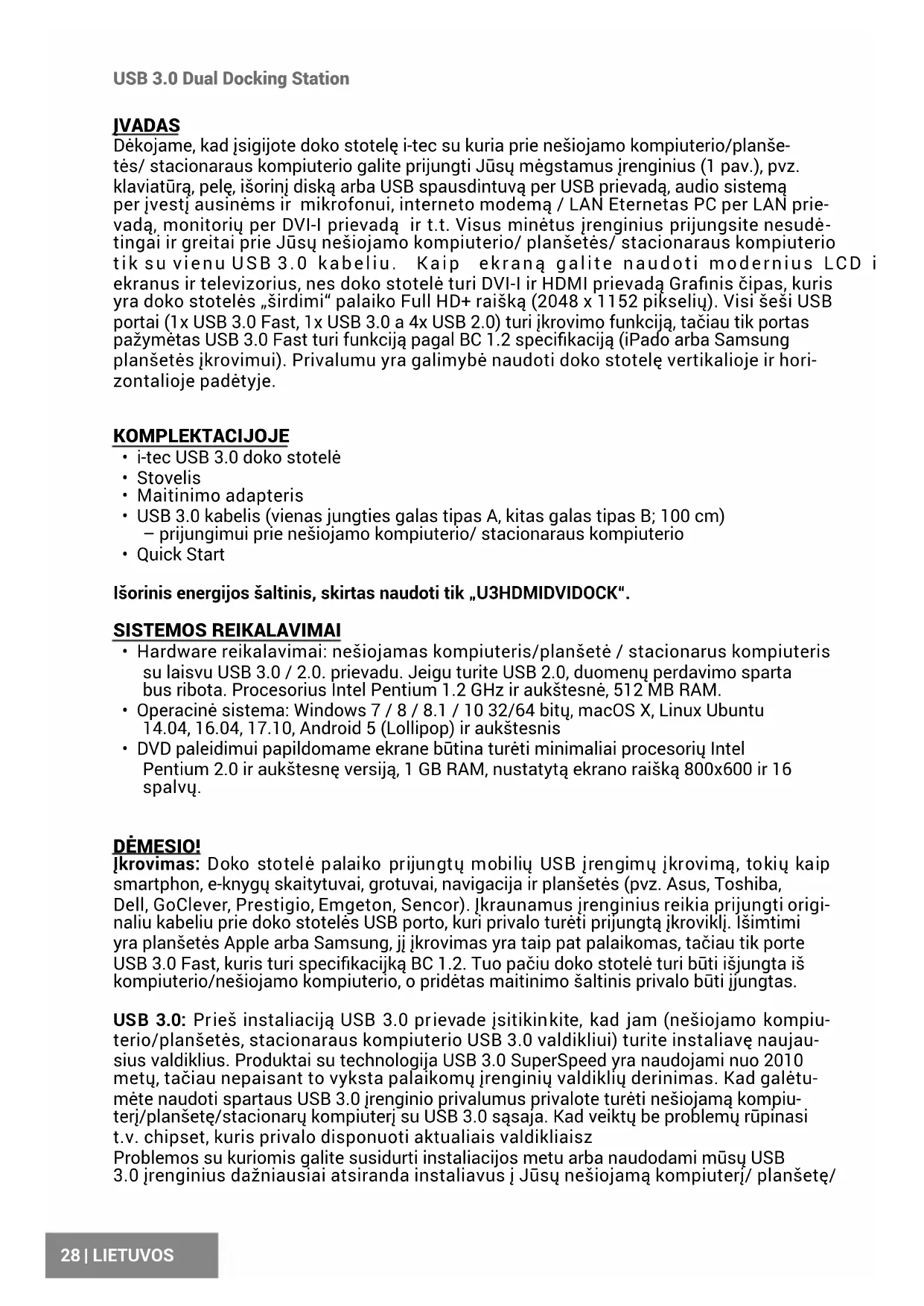 USB 3.0 Dual Docking Station LIETUVOS ĮVADAS Dėkojame, kad įsigijote doko stotelę i-tec su kuria prie nešiojamo kompiuterio/planše- tės/ stacionaraus kompiuterio galite prijungti Jūsų mėgstamus įrenginius (1 pav.), pvz. klaviatūrą, pelę, išorinį diską arba USB spausdintuvą per USB prievadą, audio sistemą per įvestį ausinėms ir mikrofonui, interneto modemą / LAN Eternetas PC per LAN prie- vadą, monitorių per DVI-I prievadą ir t.t. Visus minėtus įrenginius prijungsite nesudė- tingai ir greitai prie Jūsų nešiojamo kompiuterio/ planšetės/ stacionaraus kompiuterio tik su vienu USB 3.0 kabeliu. Kaip ekraną galite naudoti modernius LCD ir plazmos ekranus ir televizorius, nes doko stotelė turi DVI-I ir HDMI prievadą Granis čipas, kuris yra doko stotelės „širdimi“ palaiko Full HD+ raišką (2048 x 1152 pikselių). Visi šeši USB portai (1x USB 3.0 Fast, 1x USB 3.0 a 4x USB 2.0) turi įkrovimo funkciją, tačiau tik portas pažymėtas USB 3.0 Fast turi funkciją pagal BC 1.2 specikaciją (iPado arba Samsung planšetės įkrovimui). Privalumu yra galimybė naudoti doko stotelę vertikalioje ir hori- zontalioje padėtyje. KOMPLEKTACIJOJE