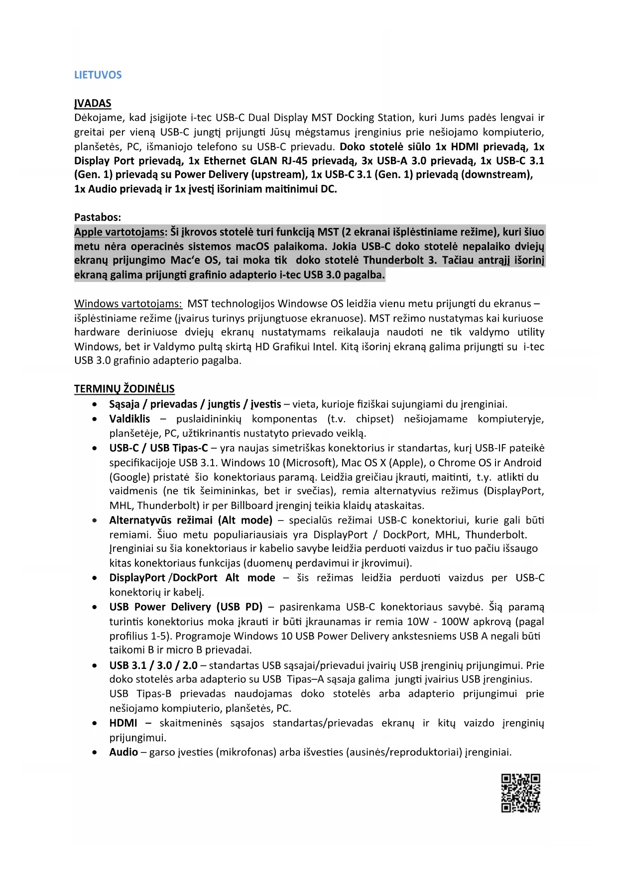 Nevystavujte extrémnym teplotám a vlhkosti vzduchu. Používajte zariadenie na plochých podložkách – vyvarujete sa tým skĺznutiu a pádu na zem. Uschovajte manuál pre neskoršie možné použitie. V súčinnosti so servisným oddelením: Overte funkčnosť po páde do vody alebo na zem. Overte funkčnosť pri prasknutí krytu. Reklamujte zariadenie nefungujúce podľa manuálu.LIETUVOS ĮVADAS Dėkojame, kad įsigijote i-tec USB-C Dual Display MST Docking Station, kuri Jums padės lengvai ir greitai per vieną USB-C jungtį prijungti Jūsų mėgstamus įrenginius prie nešiojamo kompiuterio, planšetės, PC, išmaniojo telefono su USB-C prievadu. Doko stotelė siūlo 1x HDMI prievadą, 1x Display Port prievadą, 1x Ethernet GLAN RJ-45 prievadą, 3x USB-A 3.0 prievadą, 1x USB-C 3.1 (Gen. 1) prievadą su Power Delivery (upstream), 1x USB-C 3.1 (Gen. 1) prievadą (downstream), 1x Audio prievadą ir 1x įvestį išoriniam maitinimui DC. Pastabos: Apple vartotojams: Ši įkrovos stotelė turi funkciją MST (2 ekranai išplėstiniame režime), kuri šiuo metu nėra operacinės sistemos macOS palaikoma. Jokia USB-C doko stotelė nepalaiko dviejų ekranų prijungimo Mac‘e OS, tai moka tik doko stotelė Thunderbolt 3. Tačiau antrąjį išorinį ekraną galima prijungti grafinio adapterio i-tec USB 3.0 pagalba. Windows vartotojams: MST technologijos Windowse OS leidžia vienu metu prijungti du ekranus – išplėstiniame režime (įvairus turinys prijungtuose ekranuose). MST režimo nustatymas kai kuriuose hardware deriniuose dviejų ekranų nustatymams reikalauja naudoti ne tik valdymo utility Windows, bet ir Valdymo pultą skirtą HD Grafikui Intel. Kitą išorinį ekraną galima prijungti su i-tec USB 3.0 grafinio adapterio pagalba.