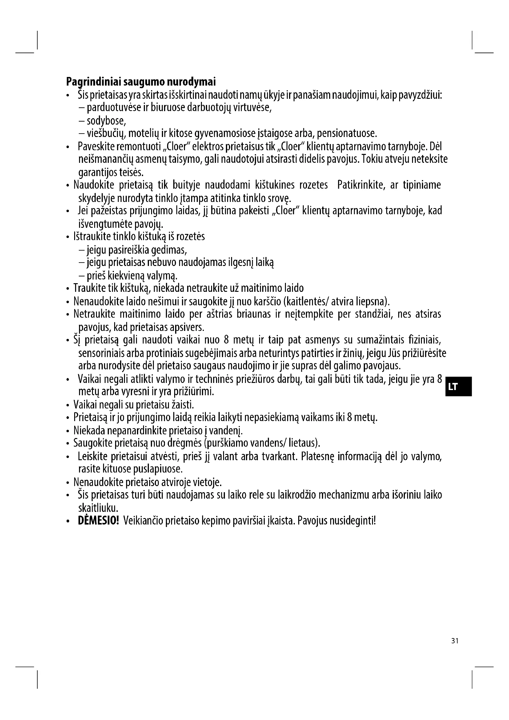 Cloer elektros prietaisai atitinka aktualias EB direktyvas ir saugumo nurodymus. Jeigu Jums atrodys, kad Jūsų Cloer prietaisas yra su defektu arba veikia netinkamai, kreipkitės Jūs prašau i savo prekybinę firmą arba Cloer-klientų aptarnavimo tarnybą. Be to, registruoti pastovūs pirkėjai yra mūsų klientų tarnybos dispozicijoje.