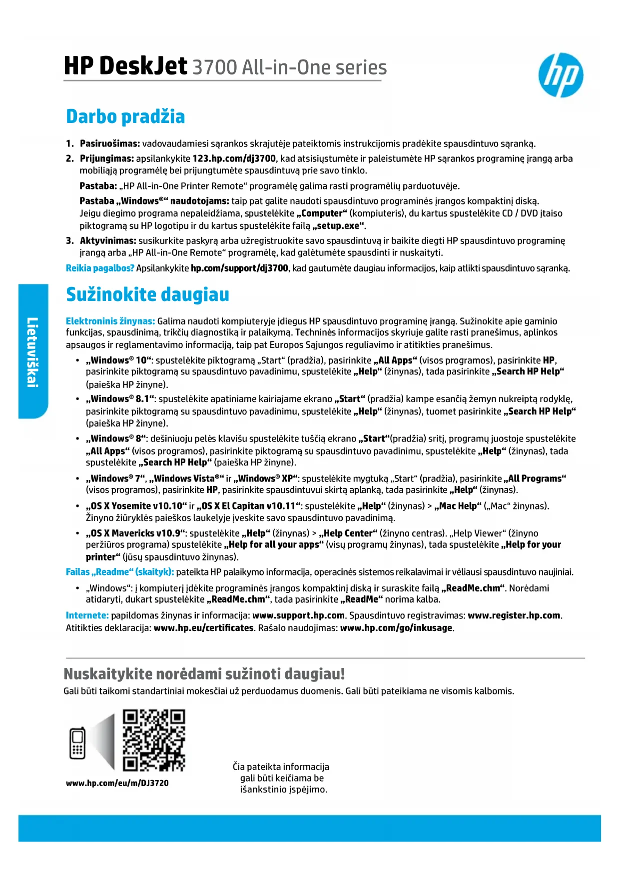 - „Windows“: į kompiuterį įdėkite programinės įrangos kompaktinį diską ir suraskite failą „ReadMe.chm“. Norėdami atidaryti, dukart spustelėkite „ReadMe.chm“, tada pasirinkite „ReadMe“ norima kalba. Internete: papildomas žinynas ir informacija: www.support.hp.com. Spausdintuvo registravimas: www.register.hp.com. Atitikties deklaracija: www.hp.eu/certicates. Rašalo naudojimas: www.hp.com/go/inkusage. HP DeskJet 3700 All-in-One series Nuskaitykite norėdami sužinoti daugiau! Gali būti taikomi standartiniai mokesčiai už perduodamus duomenis. Gali būti pateikiama ne visomis kalbomis.Čia pateikta informacija gali būti keičiama be išankstinio įspėjimo.Lietuviškai
