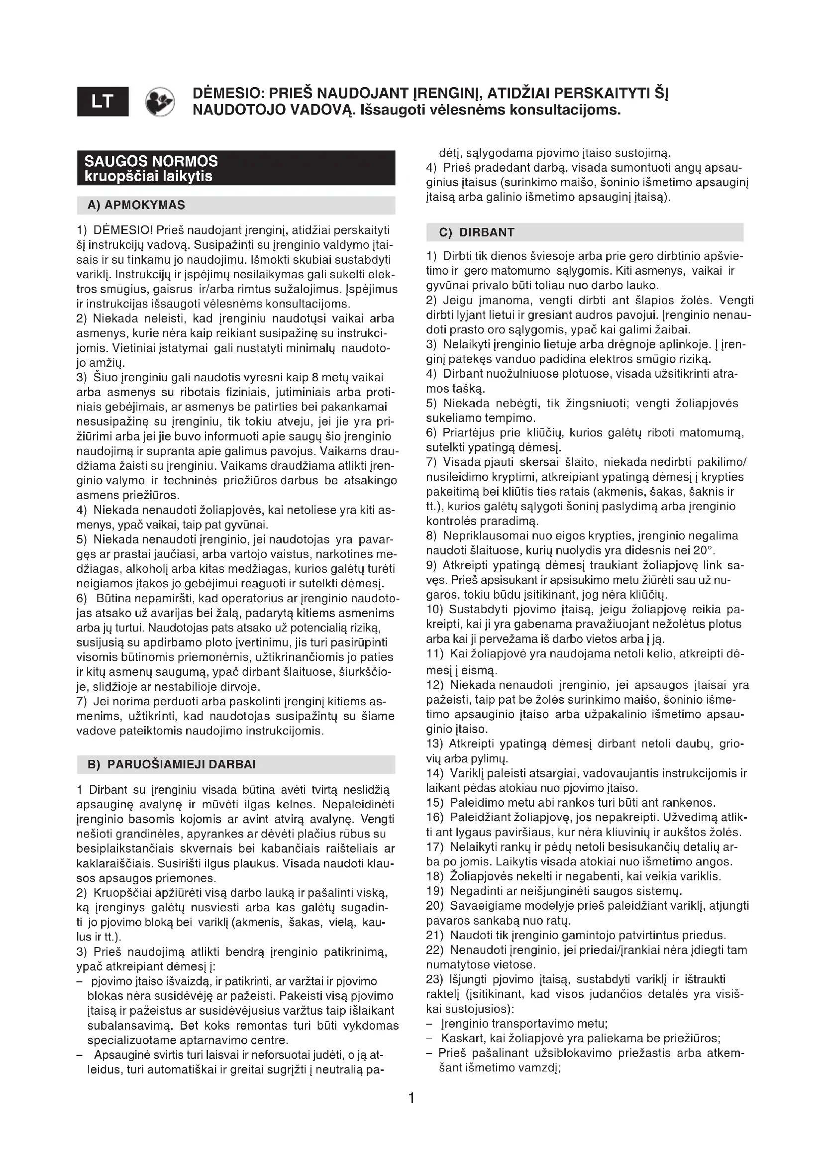 ginius įtaisus (surinkimo maišo, šoninio išmetimo apsauginį įtaisą arba galinio išmetimo apsauginį įtaisą). C) DIRBANT