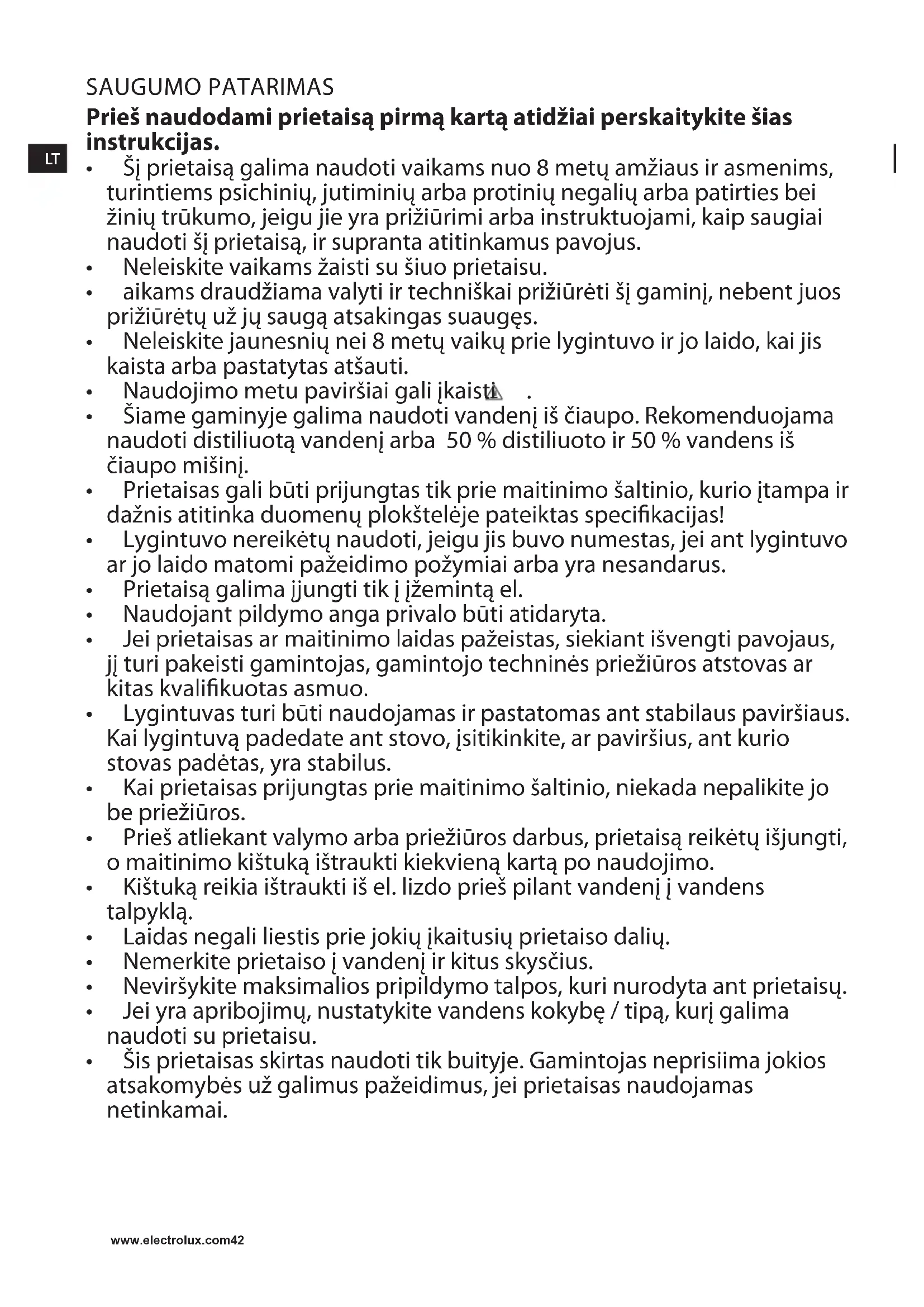 Problema Galima priežastis Sprendimas Padoplokštėnekaista,norslygintuvas įjungtas. Jungties problema Patikrinkitepagrindinįmaitinimolaidą, kištukąirmaitinimoangą. Temperatūrosvaldymorankenėlė„MIN“ padėtyje. Pasirinkiteatitinkamątemperatūrą. Lygintuvasnegaminagarų. Bake nepakankamai vandens. Pripildykitevandensbaką(žr. „Naudojmopradžia“,nr.2). Garųvaldymorankenėlėnenustatytaį garųpadėtį. Nustatykitegarųvaldymorankenėlę tarpminimaliosirmaksimaliosgarų srovėspadėčių(žr.„Lyginimolentelė“). Pasirinktatemperatūražemesnė,nei nurodyta naudojimui su garais. Padidinkitetemperatūrąmažiausiai iki . Purškimofunkcijaneveikia. Bake nepakankamai vandens. Pripildykitevandensbaką(žr. „Naudojmopradžia“,nr.2). Garųsrovėsirvertikaliosgarųsrovės funkcija neveikia. Garųsrovėsfunkcijabuvonaudojama labaidažnaipertrumpąlaikotarpą. Padėkitelygintuvąįhorizontaliąpadėtį irlukterėkitepriešnaudodamigarų srovėsfunkciją. Lygintuvasnepakankamaikarštas. Nustatykitetinkamątemperatūrą lyginimuigarais(iki ).Padėkite lygintuvąįvertikaliąpadėtįirpalaukite, koltemperatūrosindikatoriaus lemputėišsijungs. Perskylespadeišeinarudiruoželiaiir tepa lyginamus skalbinius. Jūsnaudojotekietąvandenį,todėl vandensbakelyjesusidarėkalkių nuosėdų. Panaudokite automatinio valymo funkcijąvienąarbakeliskartus. Naudojote chemines nukalkinimo nuosėdas. Nenaudokitejokiųnukalkinimo priemonių. Padoskylėseprisikaupėaudinioplaušų ir jie dega. Panaudokite automatinio valymo funkcijąvienąarbakeliskartus.Valykite padądrėgnu,minkštuskudurėliu. Galbūtaudiniaibuvonetinkamai išskalauti,arbagaminiaiyranaujiirprieš lyginimąjiedarnebuvoskalbti. Darkartątinkamaiišskalaukite skalbinius. IŠMETIMAS Atiduokiteperdirbtimedžiagas,pažymėtasšiuoženklu .Išmeskitepakuotęįatitinkamąatliekųsurinkimokonteinerį, kadjibūtųperdirbta.Padėkitesaugotiaplinkąbeižmonių sveikatąirsurinktibeiperdirbtielektrosirelektronikos prietaisųatliekas. Neišmeskitešiuoženklu pažymėtųprietaisųkartu sukitomisbuitinėmisatliekomis.Atiduokitešįgaminįį vietosatliekųsurinkimopunktąarbasusisiekitesuvietnos savivaldybedėlpapildomosinformacijos. www.electrolux.com44LV
