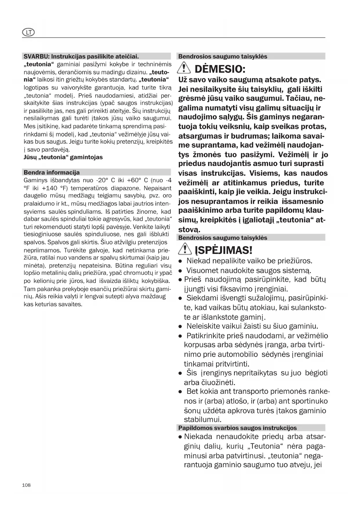 SVARBU: Instrukcijas pasilikite ateičiai. „teutonia“ gaminiai pasižymi kokybe ir techninėmis naujovėmis, derančiomis su madingu dizainu. „teuto- nia“ laikosi itin griežtų kokybės standartų. „teutonia“ logotipas su vaivorykšte garantuoja, kad turite tikrą „teutonia“ modelį. Prieš naudodamiesi, atidžiai per- skaitykite šias instrukcijas (ypač saugos instrukcijas) ir pasilikite jas, nes gali prireikti ateityje. Šių instrukcijų nesilaikymas gali turėti įtakos jūsų vaiko saugumui. Mes įsitikinę, kad padarėte tinkamą sprendimą pasi- rinkdami šį modelį, kad „teutonia“ vežimėlyje jūsų vai- kas bus saugus. Jeigu turite kokių pretenzijų, kreipkitės į savo pardavėją. Jūsų „teutonia“ gamintojas Bendra informacija Gaminys išbandytas nuo -20° C iki +60° C (nuo -4 °F iki +140 °F) temperatūros diapazone. Nepaisant daugelio mūsų medžiagų teigiamų savybių, pvz. oro pralaidumo ir kt., mūsų medžiagos labai jautrios inten- syviems saulės spinduliams. Iš patirties žinome, kad dabar saulės spinduliai tokie agresyvūs, kad „teutonia“ turi rekomenduoti statyti lopšį pavėsyje. Venkite laikyti tiesioginiuose saulės spinduliuose, nes gali išblukti spalvos. Spalvos gali skirtis. Šiuo atžvilgiu pretenzijos nepriimamos. Turėkite galvoje, kad netinkama prie- žiūra, ratilai nuo vandens ar spalvų skirtumai (kaip jau minėta), pretenzijų nepateisina. Būtina reguliari visų lopšio metalinių dalių priežiūra, ypač chromuotų ir ypač po kelionių prie jūros, kad išvaizda išliktų kokybiška. Tam pakanka prekyboje esančių priežiūrai skirtų gami- nių. Ašis reikia valyti ir lengvai sutepti alyva maždaug kas keturias savaites. Bendrosios saugumo taisyklės DĖMESIO: Už savo vaiko saugumą atsakote patys. Jei nesilaikysite šių taisyklių, gali iškilti grėsmė jūsų vaiko saugumui. Tačiau, ne- galima numatyti visų galimų situacijų ir naudojimo sąlygų. Šis gaminys negaran- tuoja tokių veiksnių, kaip sveikas protas, atsargumas ir budrumas; laikoma savai- me suprantama, kad vežimėlį naudojan- tys žmonės tuo pasižymi. Vežimėlį ir jo priedus naudojantis asmuo turi suprasti visas instrukcijas. Visiems, kas naudos vežimėlį ar atitinkamus priedus, turite paaiškinti, kaip jie veikia. Jeigu instrukci- jos nesuprantamos ir reikia išsamesnio paaiškinimo arba turite papildomų klau- simų, kreipkitės į įgaliotąjį „teutonia“ at- stovą. Bendrosios saugumo taisyklės ĮSPĖJIMAS! ● Niekad nepalikite vaiko be priežiūros. ● Visuomet naudokite saugos sistemą. ● Prieš naudojimą pasirūpinkite, kad būtų įjungti visi fiksavimo įrenginiai. ● Siekdami išvengti sužalojimų, pasirūpinki- te, kad vaikas būtų atokiau, kai sulanksto- te ar išlankstote gaminį. ● Neleiskite vaikui žaisti su šiuo gaminiu. ● Patikrinkite prieš naudodami, ar vežimėlio korpusas arba sėdynės įranga, arba tvirti- nimo prie automobilio sėdynės įrenginiai tinkamai pritvirtinti. ● Šis įrenginys nepritaikytas su juo bėgioti arba čiuožinėti. ● Bet kokia ant transporto priemonės ranke- nos ir (arba) atlošo, ir (arba) ant sportinuko šonų uždėta apkrova turės įtakos gaminio stabilumui. Papildomos svarbios saugos instrukcijos ● Niekada nenaudokite priedų arba atsar- ginių dalių, kurių „Teutonia“ nėra paga- minusi arba patvirtinusi. „teutonia“ nega- rantuoja gaminio saugumo tuo atveju, jei109